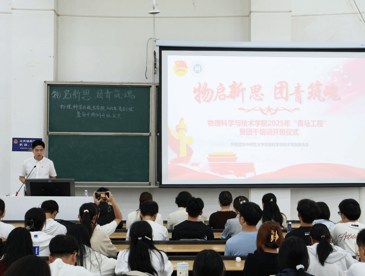 华大青年讯(通讯员 陈诗曼 李怡霏)为全面提升物理科学与技术学院团学骨干的综合素质与履职能力,10月17日中午,物理科学与技术学院(以下简称“物院”)2025年“青马工程”暨团干培训开班仪式在9501教室举行。物院党委副书记马英,团委书记舒佳欣,团委副书记王棣及2025级辅导员刘琦、谢雨村参加了此次开班仪式。仪式由物院学生团委副书记王李嘉良主持。
