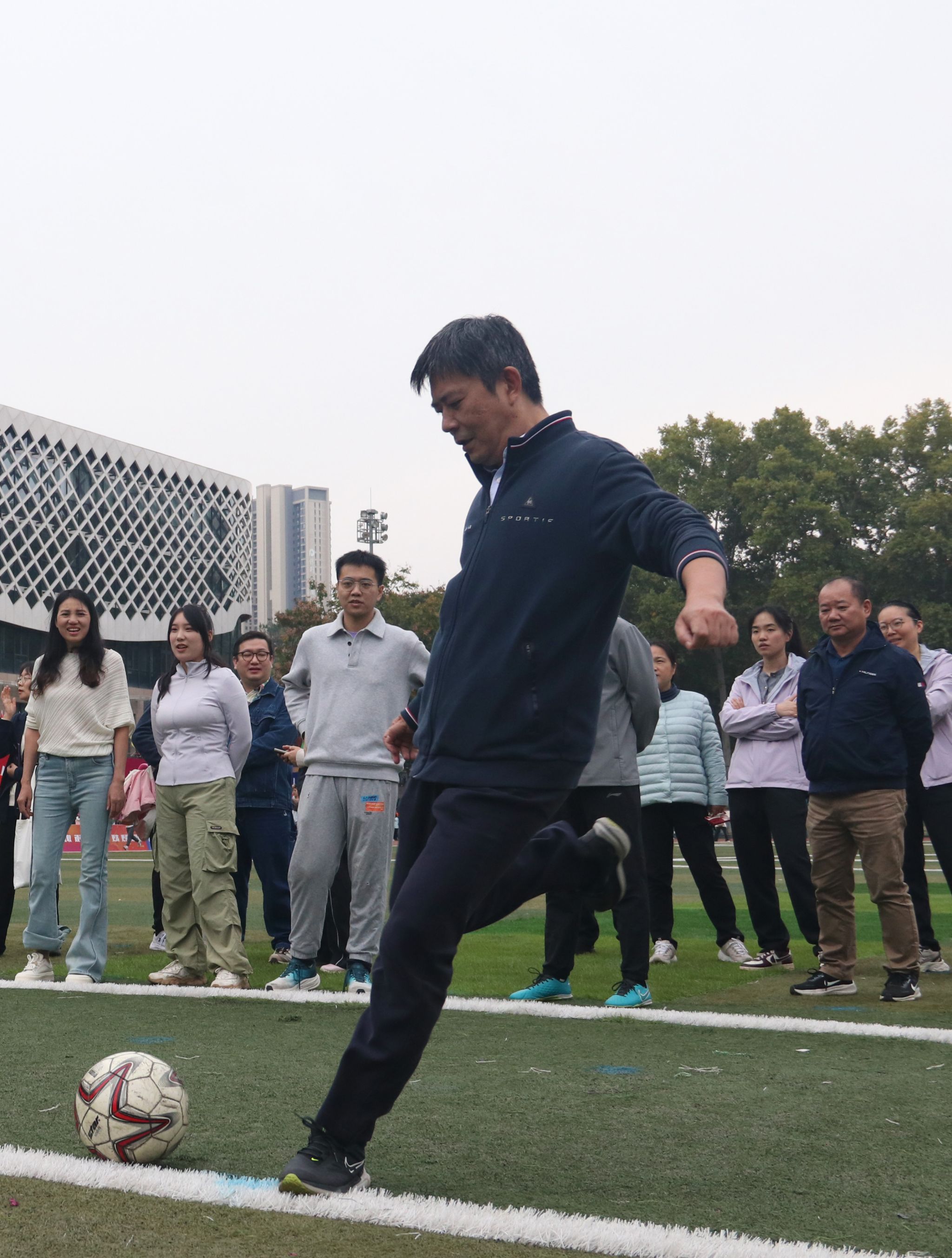 佑铭体育场内,物院教职工们瞄准球门靶位,做好助跑、摆腿准备,随后果断击球。尽管部分射门角度判断未达预期,他们却能及时调整状态。这份认真投入的状态,同样成为物院教职工们赛场风采的生动注脚。