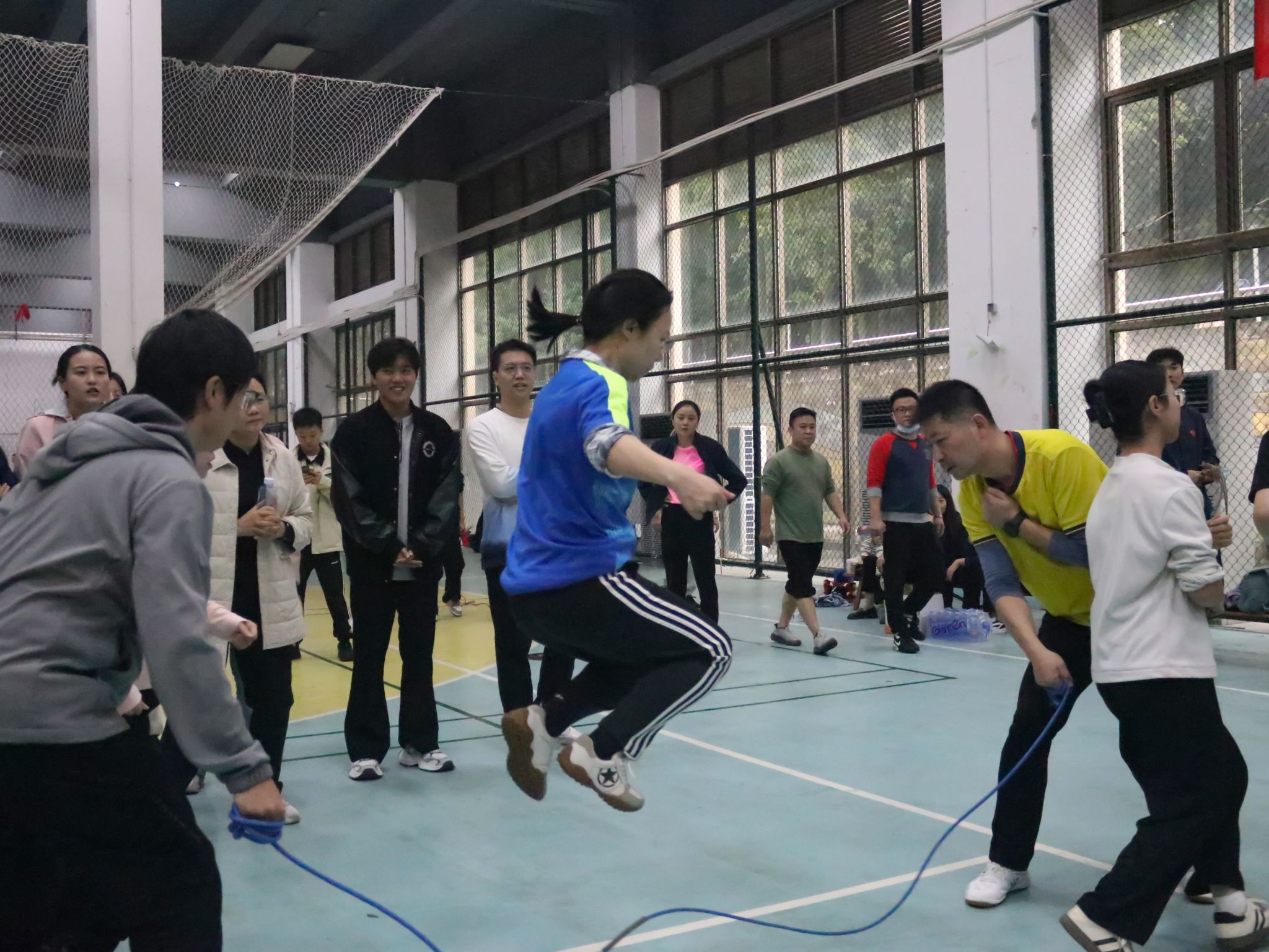 跳绳比赛前,物院教职工赛提前到场开展热身,交流动作技巧并确认站位,为比赛做充分准备。哨声起后,长绳甩动,队员们动作齐整、衔接流畅;若出现失误,便快速调整节奏,始终保持稳定发挥。最终,团队以176下的成绩获得跳绳比赛的第二名,展现出教职工协作精神与昂扬风采。