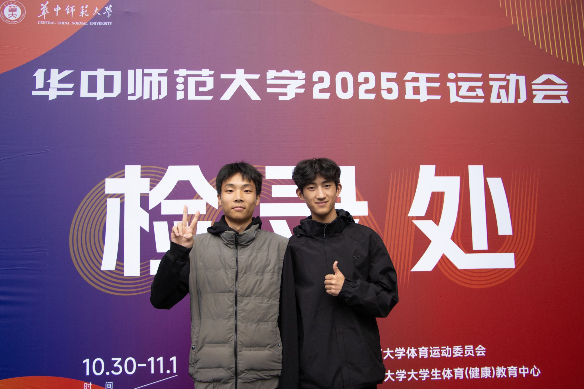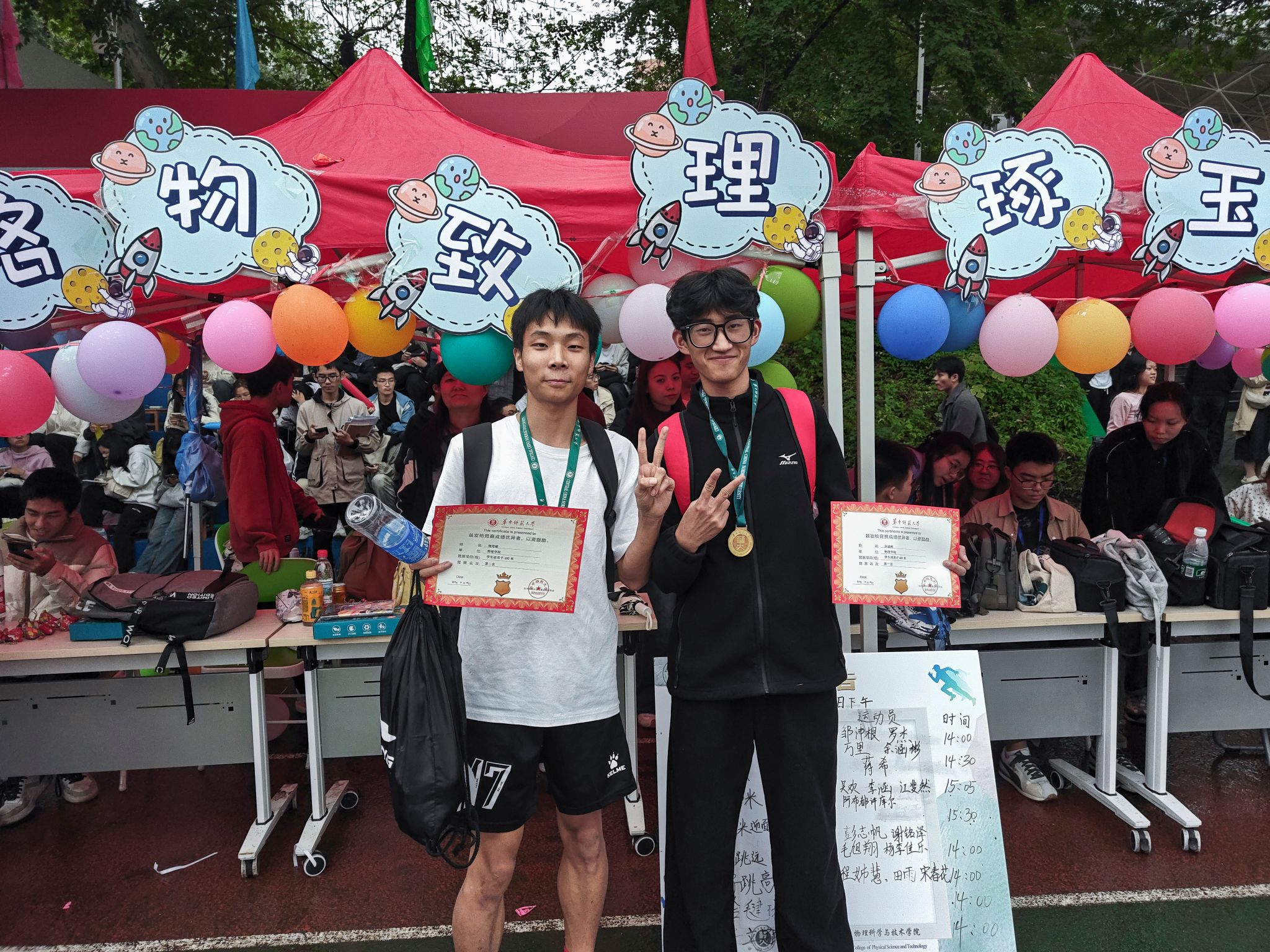 两人均是物理学院2024级本科生,余涵彬来自电子信息专业,邹沛根来自物理学基地班。两人出于对运动的热爱相识,“我们俩平时就一起训练,互相打气。”,在赛后采访中余涵彬这样说。从清晨的跑道到傍晚的拉伸,这种并肩作战的默契,让他们在比赛中不仅是对手,更是彼此最坚实的后盾。