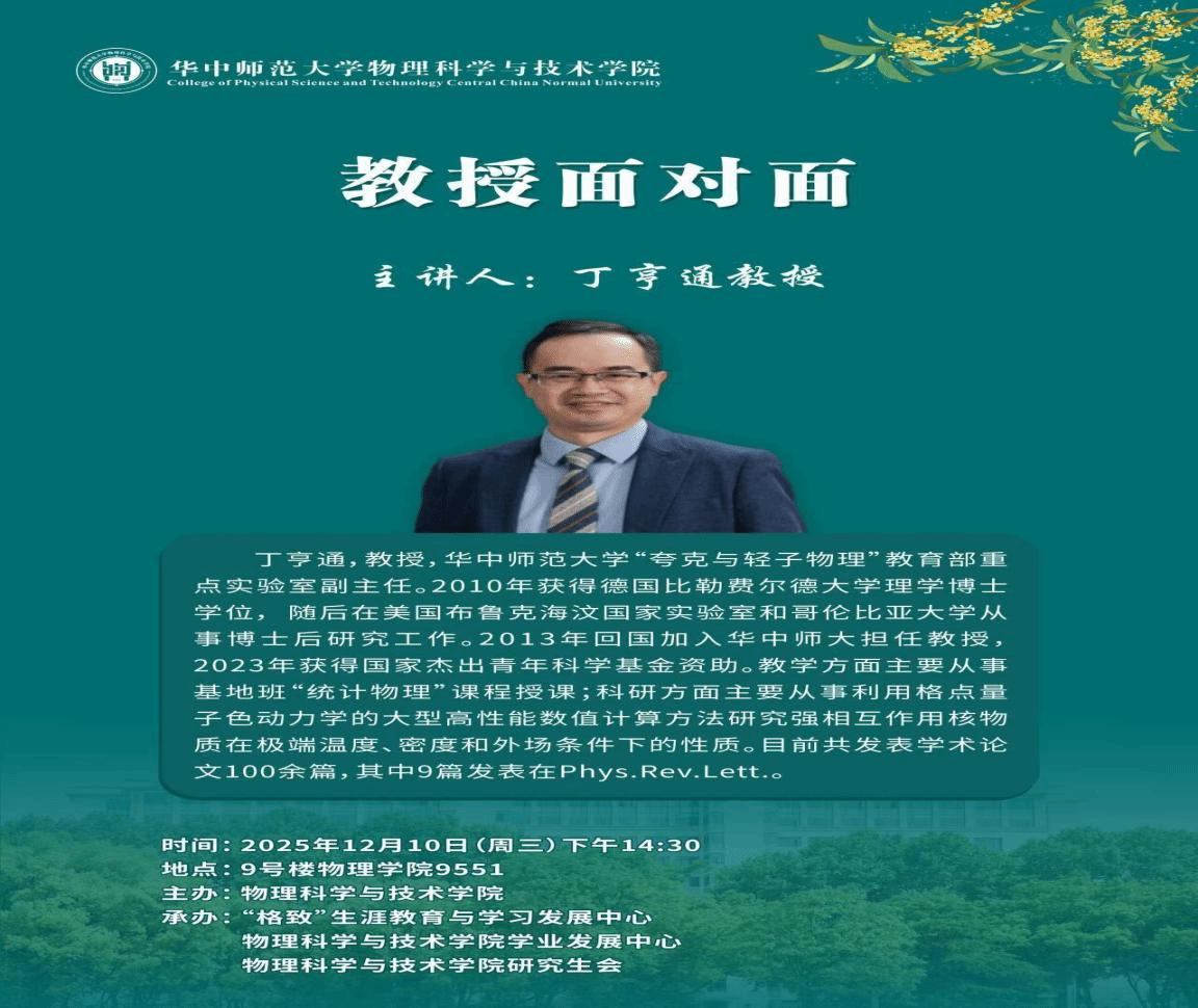 丁亨通,教授,华中师范大学“夸克与轻子物理”教育部重点实验室副主任。2010年获得德国比勒费尔德大学理学博士学位, 随后在美国布鲁克海汶国家实验室和哥伦比亚大学从事博士后研究工作。2013年回国加入华中师大担任教授,2023年获得国家杰出青年科学基金资助。教学方面主要从事基地班“统计物理”课程授课;科研方面主要从事利用格点量子色动力学的大型高性能数值计算方法研究强相互作用核物质在极端温度、密度和外场条件下的性质。目前共发表学术论文100余篇,其中9篇发表在Phys.Rev.Lett.。