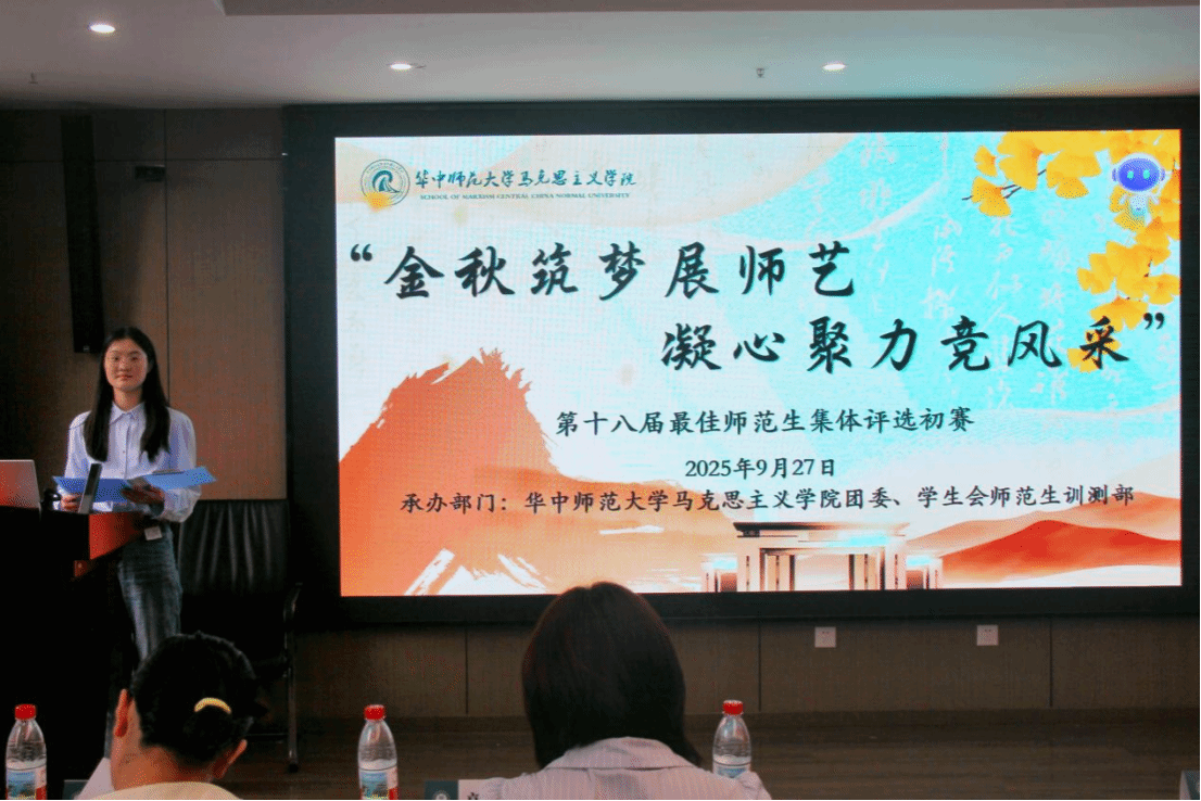 华大青年讯(通讯员 王思齐)秋意渐浓,青春正好。9月27日下午,“金秋筑梦展师艺,凝心聚力竞风采”马克思主义学院(以下简称“马院”)第十八届最佳师范生集体评选活动在文科综合楼407会议室举行。2023级本科生辅导员韩絮、2024级本科生辅导员赵芸逸、马院第一团委副书记郭爽爽、第二团委副书记陈佳韵以及执行主席司陈雨出席本次活动并担任评委。活动由师范生训测部负责人赖思瑶主持,2024级全体公费师范生全程参与。