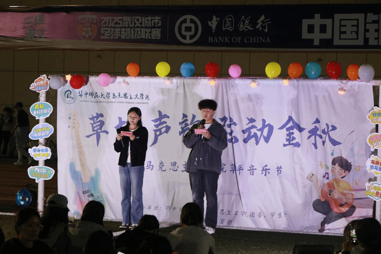 华大青年讯(通讯员 杨文欢)10月17日晚,马克思主义学院(以下简称“马院”)“草地声韵,弦动金秋”草坪音乐节于佑铭田径场举办。本次活动由马院团委、学生会文艺部、体育部主办。文艺部成员赵程皓、甘馨蕾主持此次活动。参赛选手们各展风采,现场观众积极互动。