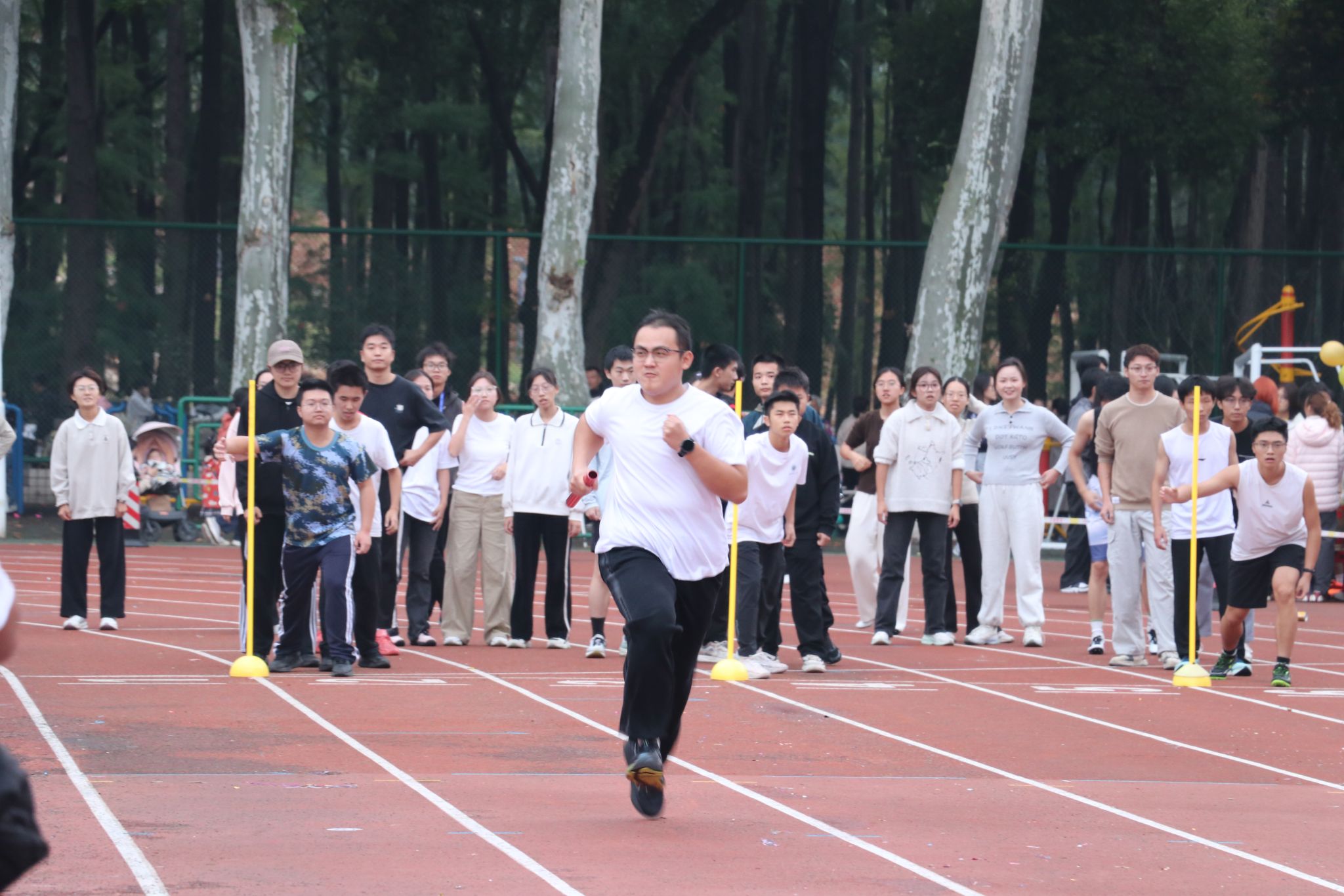 随着发令员一声清脆的枪响,比赛正式开始。马院的第一棒选手如离弦之箭般冲出起跑线,他步伐矫健,全力冲刺,瞬间点燃了全场的气氛。短短的50米,是个人速度的极致展现;稳稳的交棒,是团队信任的无言契约。赛道上,每一位马院学子都全力以赴,他们紧握接力棒,奋力摆臂,双腿有力地蹬踏地面,向着对面的队友狂奔。