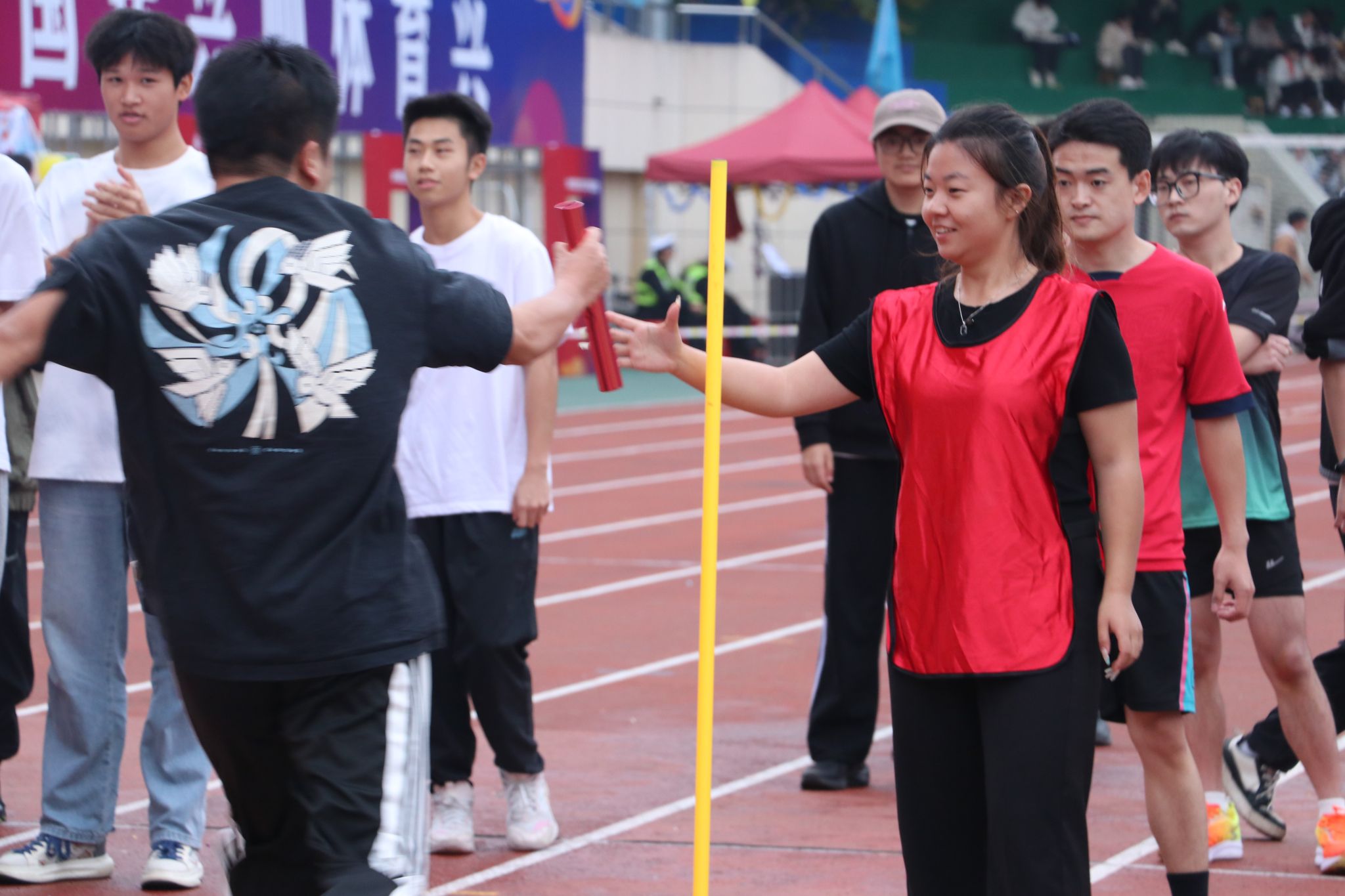 交接棒区域是决定胜负的关键。只见马院的队员们眼神专注,身体前倾,手臂向后精准伸出。迎面而来的队友则稳稳地将接力棒递出,“接!”一声短促有力的指令,伴随着接力棒的完美传递,凝聚着两个人的信任与整个团队的期望。这一接一送间,流畅无比,展现了队员们赛前反复演练的成果和极高的默契度。