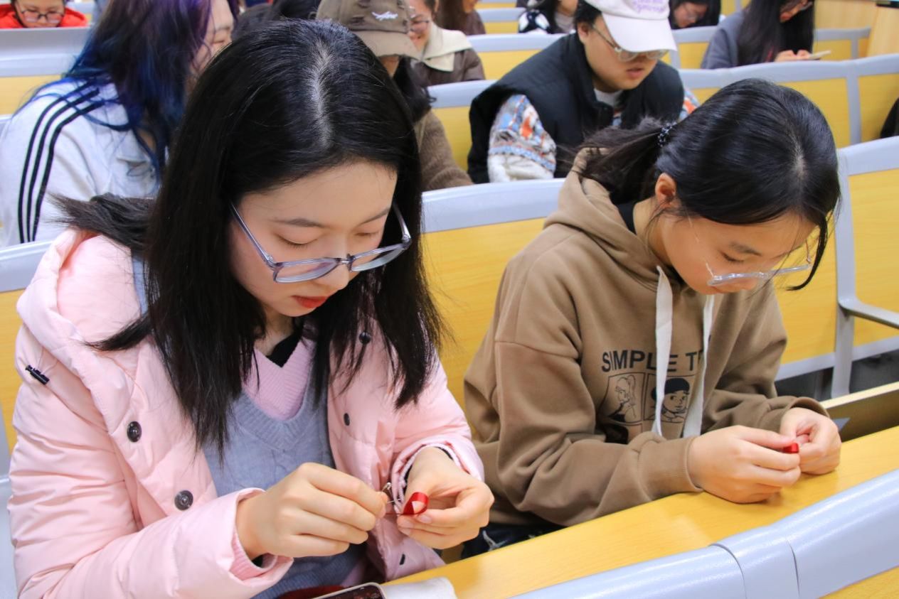 知识宣讲后,活动进入“创意手工”环节。工作人员为每位参与者分发红色丝带、别针、胶水,在轻柔背景音乐中,同学们动手制作“红丝带”标志。这枚象征对HIV感染者及艾滋病病人关怀支持、对生命热爱渴望的国际通用标识,在同学们手中被赋予了更具体、个人的情感联结。制作完成后,工作人员将成品收集,汇聚成一片爱的红色海洋。