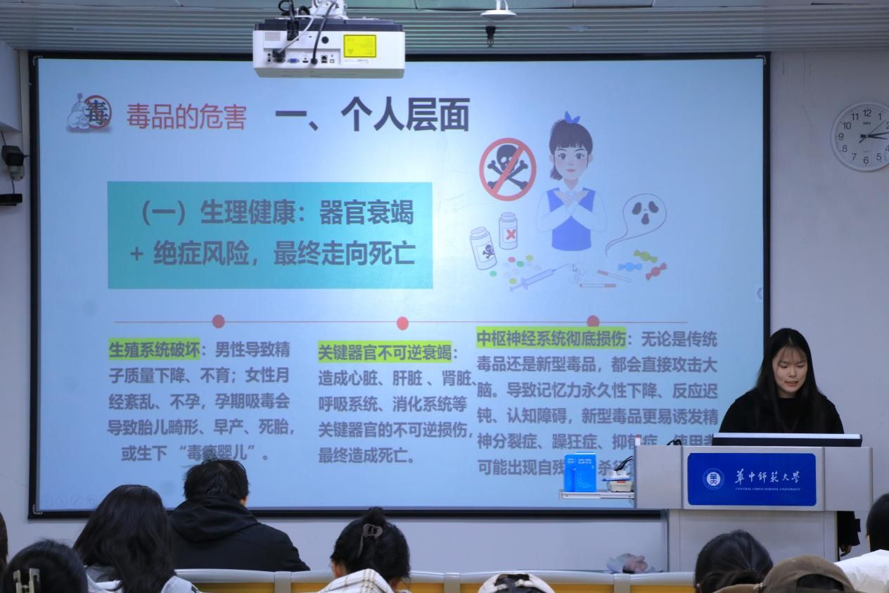 吴颖玲强调易感染人群特征,基于三大传播途径客观分析高风险行为群体,着重指出“任何不采取防护措施的高危行为都可能感染病毒”,避免污名化特定群体,引导聚焦行为风险。许悠然讲解的预防知识是重点,她详细介绍坚持使用安全套、拒绝共用针具、确保血液安全、暴露后预防等措施,针对青年学生群体,强调树立正确观念、自尊自爱、拒绝高危行为的重要性。孙杰芳、刘通昊拓展视角,将艾滋病与毒品联系起来,剖析共用注射器吸毒导致血液传播的高风险,警示同学们远离毒品。