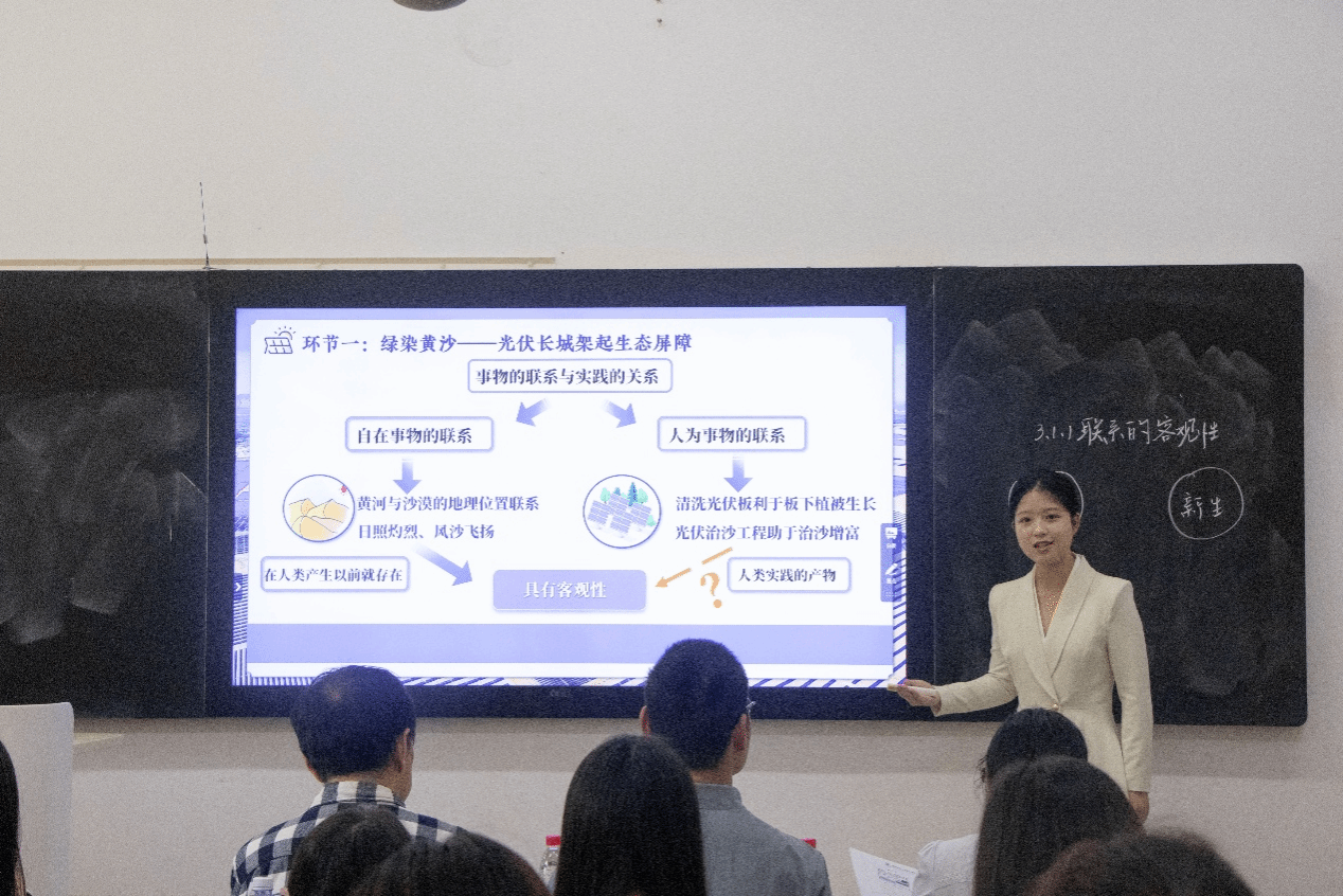 选手方秀以“联系的客观性”为主题,通过生动的案例展示和严谨的逻辑分析,引导学生理解联系的客观性。她运用二氧化碳在自然界中的循环过程以及国际沙漠论坛中各国合作应对环境问题的具体案例,让学生深刻体会到联系的客观性在现实世界中的体现。选手王媛媛聚焦于“整体与部分相互联系”的哲学思想,借助七巧板游戏,通过精巧的“鱼跃七巧”“一巧千形”等互动环节,让学生在实践中感悟整体与部分之间的相互依赖、相互影响与相互转化。其他选手聚焦于多样化的主题,结合Deepseek、沙漠治理以及黄花菜产业发展等丰富材料,将抽象的哲学知识转化为贴近生活的教学内容。