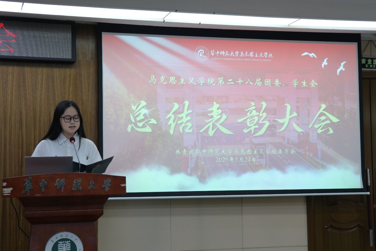 华大青年讯(通讯员 刘婧蕾)为总结工作成果,谋划未来发展蓝图,马克思主义学院(以下简称“马院”)第二十八届团委、学生会于5月24日在逸夫国际会议中心一楼报告厅隆重举行总结表彰大会。本次大会旨在传承马院团学的精神内核,激励团学成员们踏上砥砺奋进的新征程,回顾了过去一年的工作成果,表彰了先进集体和个人,展现了马院团学成员的青春风采。该会议由共青团华中师范大学马克思主义学院委员会主办,华中师范大学马克思主义学院团委、学生会办公室承办,由主席团成员邹涛担任主持人。
