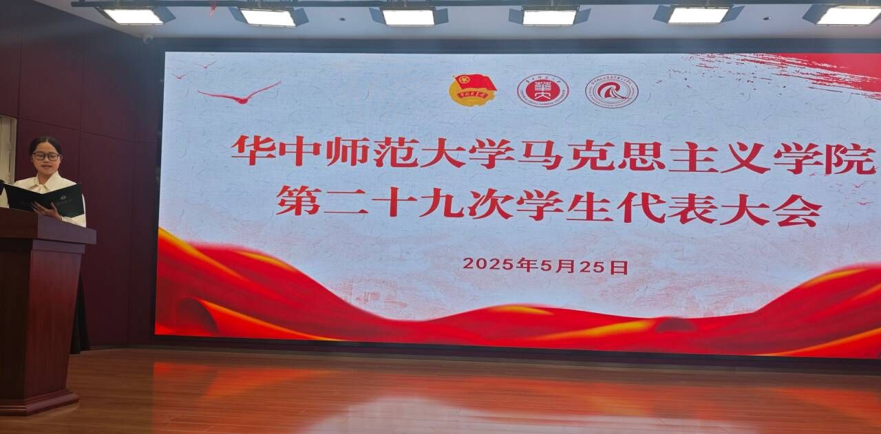 华大青年讯(通讯员 杨淑睿)2025年5月25日上午,华中师范大学马克思主义学院第二十九次学生代表大会在文科综合楼101报告厅举行。马克思主义学院党委副书记邵莉莉,团委书记李欣,本科生辅导员赵芸逸、韩絮、方倩、高源,马克思主义学院研究生会主席夏晶晶,华中师范大学学生会执行主席陈鹏宇出席本次会议。本次大会由学生会主席团成员邹涛主持。