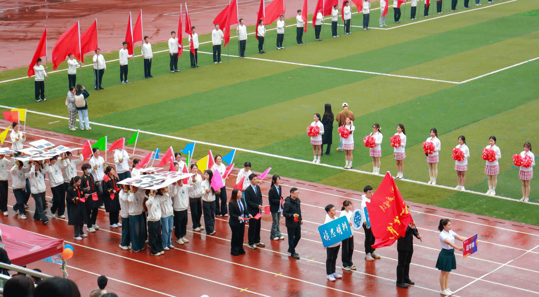 伴随着轻快的旋律,团体操表演队伍身着统一运动服入场,瞬间点亮赛场。他们动作整齐划一如精密钟表齿轮。手臂在空中划出绚丽弧线,与学子们灿烂的笑容相映成趣。当五星红旗从表演队伍中舒展飘扬,全场掌声雷动,学子们灵动的转身、跳跃,将青春的朝气与活力融入每一个动作,仿佛一幅流动的青春画卷在佑铭体育场徐徐展开。