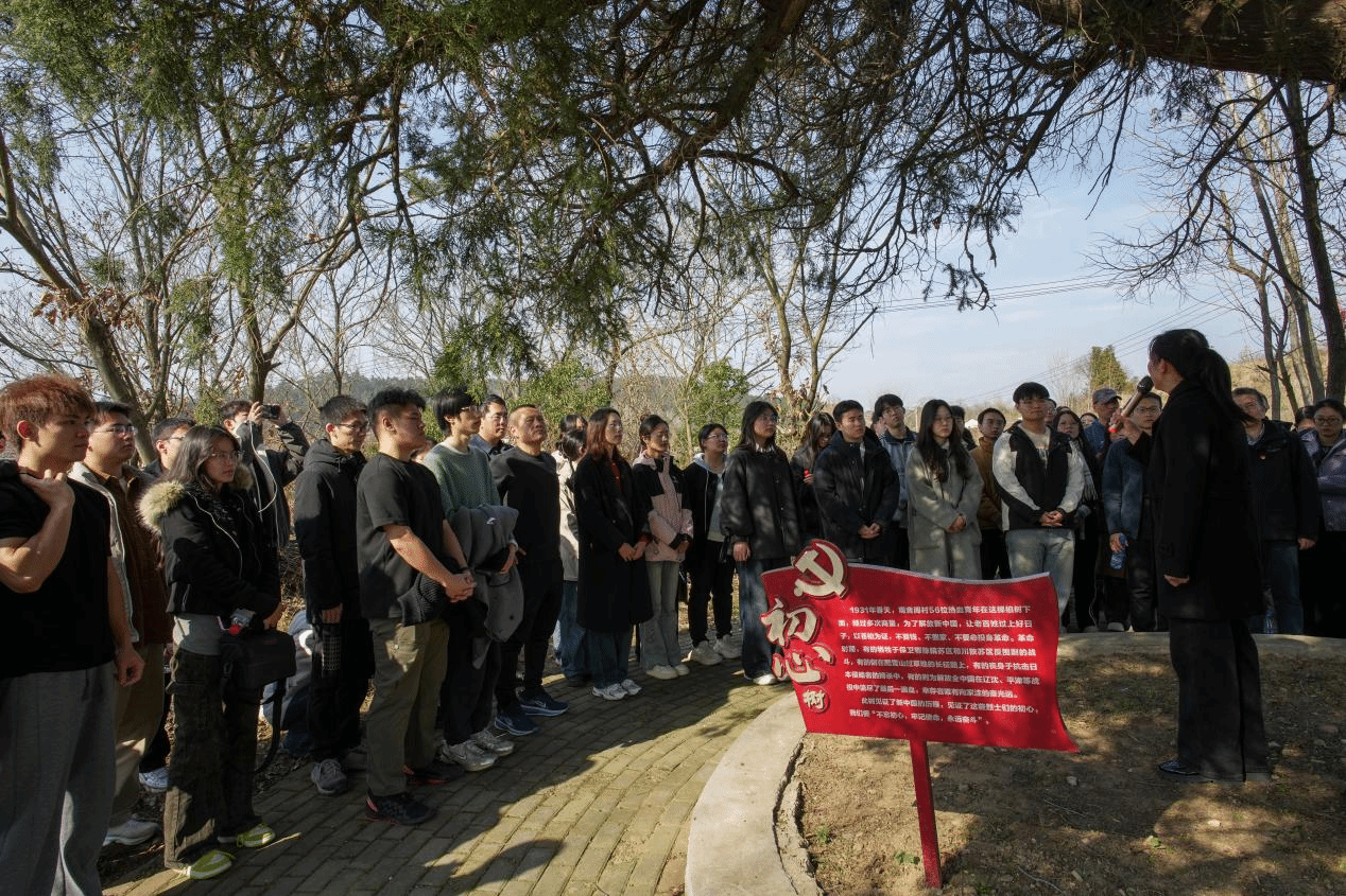 午后,师生一行前往观音阁村。在烈士陵园广场,全体人员向该村牺牲的 55 位烈士默哀。初心树下,秦光远将军深耕统战战场的革命故事催人泪下;红色家书教学环节,将军亲属的现场讲述,让字里行间的家国情怀愈发鲜活,师生们动容之余,纷纷提笔写下感悟。