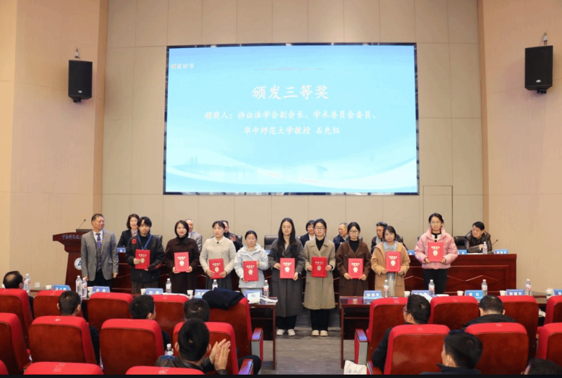 年会开幕式后举行了“立丰杯”湖北省诉讼法学优秀论文及“新苗奖”颁奖仪式。本次年会共收录全省各地学术论文将近300篇,经过严格评审,一批兼具理论深度与实践价值的成果脱颖而出。法学院提交的多篇论文因选题紧扣司法实践热点、论证严谨充分受到评审专家关注,多篇论文获奖,充分体现了法学院法学研究“扎根实践、服务法治”的鲜明导向。颁奖环节由省法学会诉讼法学研究会副会长主持,与会领导为获奖代表颁发证书,现场掌声雷动,激励着青年法学研究者深耕学术、勇攀高峰。