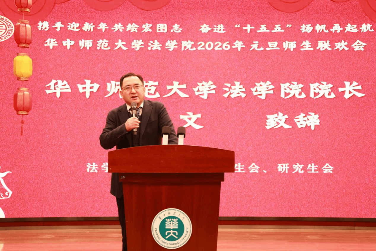 院长丁文在致辞中向在场师生致以诚挚的新年祝福。他表示,2025年,党的二十届四中全会胜利召开,为法学院发展指明方向。在全院师生的凝心聚力下,法学院各项事业实现快步跃升,党建思政工作稳步推进、教学科研领域成果频出、人才培养质量稳步提升。展望2026年,法学院正稳步推进学院“十五五”规划的谋划工作。他表示,法学院将继续凝聚师生合力,携手奋进、务实笃行,聚焦重点任务,以更加饱满的热情、更加务实的作风,推动法学院高质量发展迈入新台阶。