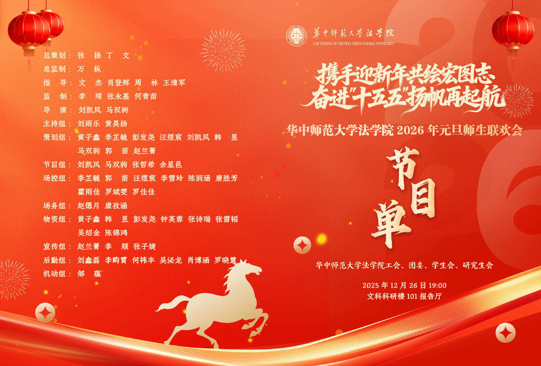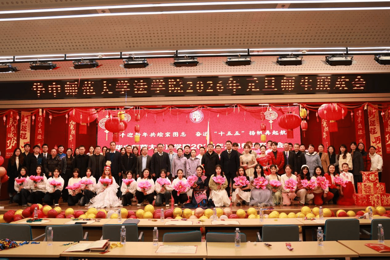 华大青年讯(通讯员 陈瑶)12月26日,法学院在文科综合楼报告厅举办2026年元旦师生联欢会。学院党政领导班子成员、离退休老同志代表、教职工代表、学生代表欢聚一堂,以欢歌笑语送别旧岁,用热忱期盼迎接新年。