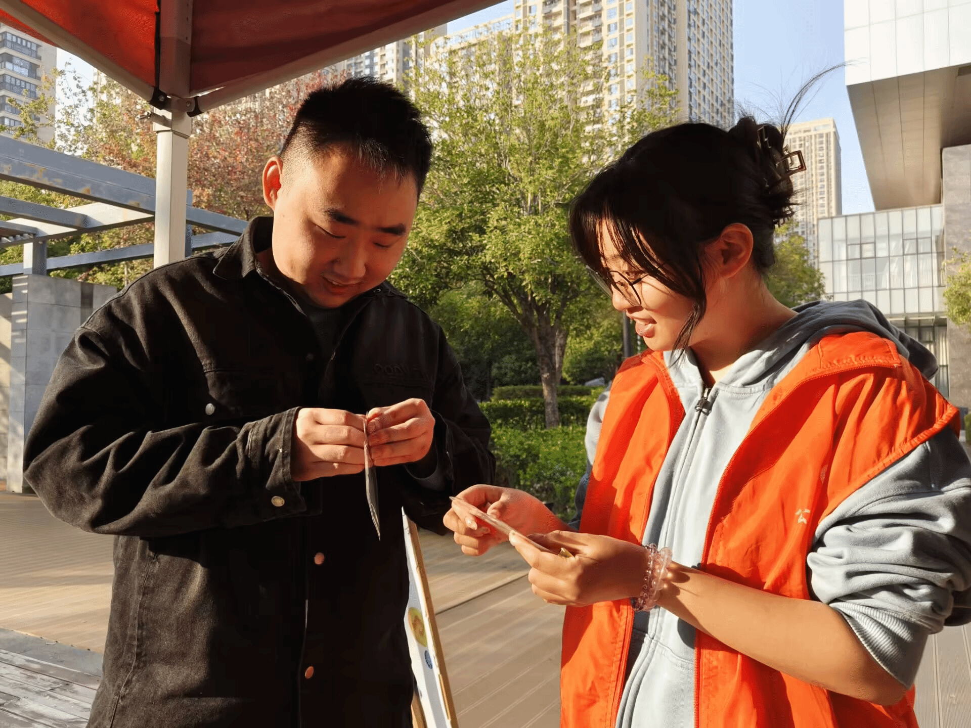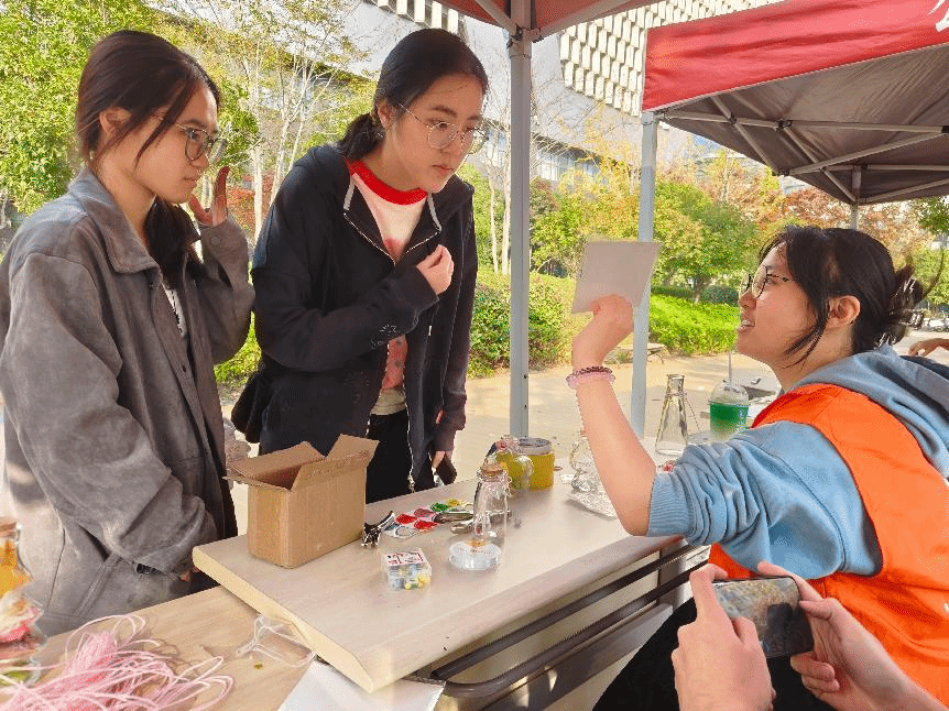 下午两点,“秋意拾光”活动在融融秋阳中正式开始。志愿者向过往同学展示提前制作的“秋意瓶”、叶脉书签等样品,并积极引导同学参与。活动中,志愿者有序分发落叶、玻璃瓶、引线、打孔器等创作物料,全程陪伴协助并耐心答疑。同学们创意创作期间,志愿者始终穿梭于各点位,及时补充工具、指导手工技巧、维护现场秩序,保障活动顺畅推进。