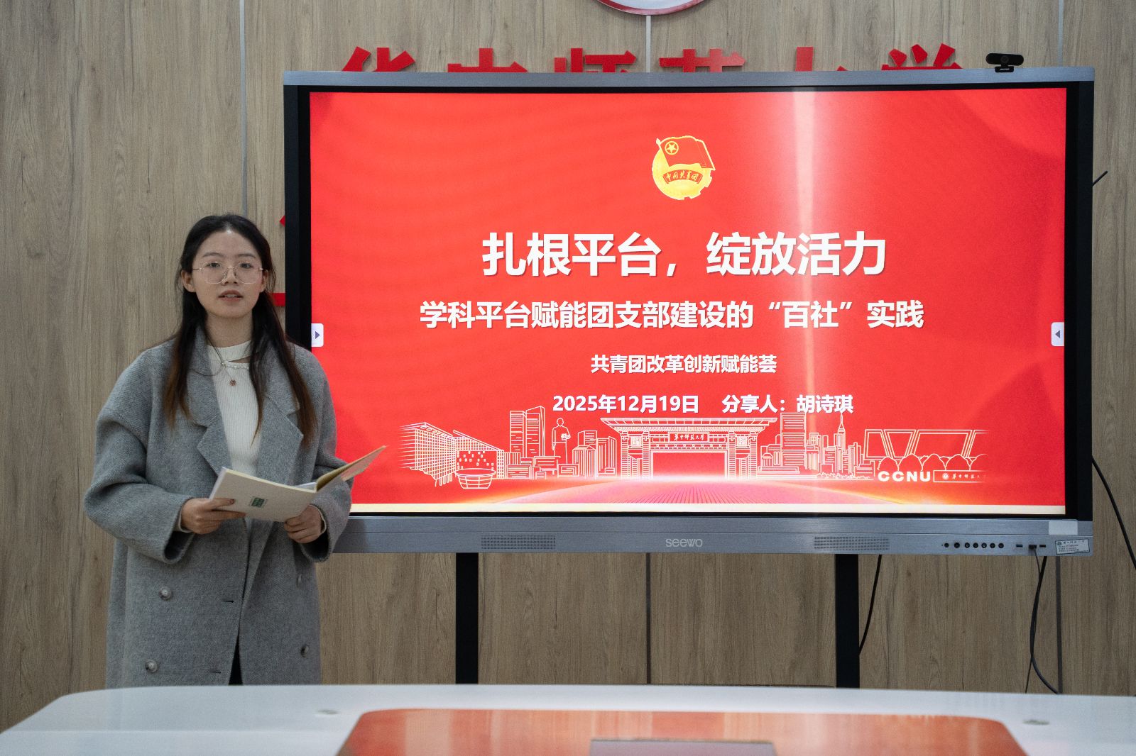 胡诗琪围绕“扎根平台,绽放活力:学科平台赋能团支部建设的‘百社’实践”这一主题进行交流。她以所在团支部建设为例,详细介绍了如何依托学科平台整合资源、开展特色团务活动,展现了基层团组织在学科实践中凝聚青年、服务青年的生动实践,为以专业力量赋能团支部建设提供了可借鉴的经验模板。