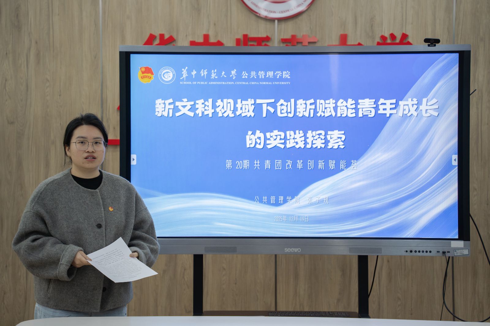 华大青年讯(通讯员 张宁 张宇恒)为深入推进共青团改革创新,进一步推进专业赋能青年成长,12月19日,公共管理学院于南湖综合楼N9002会议室举办第22期共青团改革创新赋能荟。本次活动聚焦“专业赋能成长,实干担当使命”这一主题,邀请公共管理学院团委书记张子规,青年志愿者协会会长王欣平,研究生“百社十年”观察平台团支部团支书胡诗琪开展专题分享。