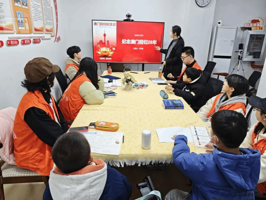 随后,志愿者开展了澳门回归26周年主题宣讲。以金莲花为引入,介绍了澳门的地标、美食及回归历程与意义。宣讲后,志愿者与孩子们齐唱《七子之歌》,共同庆祝澳门回归。在“超轻黏土制莲花”和“庆祝澳门回归26周年手抄报”艺术创作环节中,志愿者与小朋友们携手完成一朵朵莲花与一幅幅手抄报,以巧手匠心表达对澳门繁荣与国家统一的真挚祝愿。