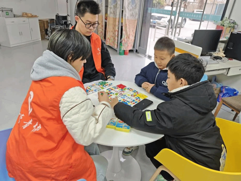 课业辅导结束后,志愿者组织小朋友们前往活动室开展象棋、飞行棋等棋类活动。棋局中,孩子们积极与志愿者交流策略,既放松了身心,也锻炼了思维与社交能力。活动全程,志愿者们时刻关注小朋友的动向,及时提醒安全注意事项,确保活动在愉快而安全的氛围中进行。