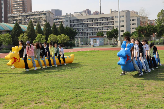 下半场共有“两人三足”、“背对背夹球竞速”和“桃花朵朵开”三个项目。“两人三足”项目考验队员之间的默契配合。队员们一字排开,一只腿分别与队员捆绑在一起,一同奔向终点。“背对背夹球竞速”项目开始前,队员们摩拳擦掌、势在必得。随着一声令下,队员们在齐声的口号中,默契配合,尽展团结魅力。在“桃花朵朵开”项目中,同学们通过之前环节的彼此认识、相互了解,默契配合。现场气氛热烈,欢声笑语此起彼伏。