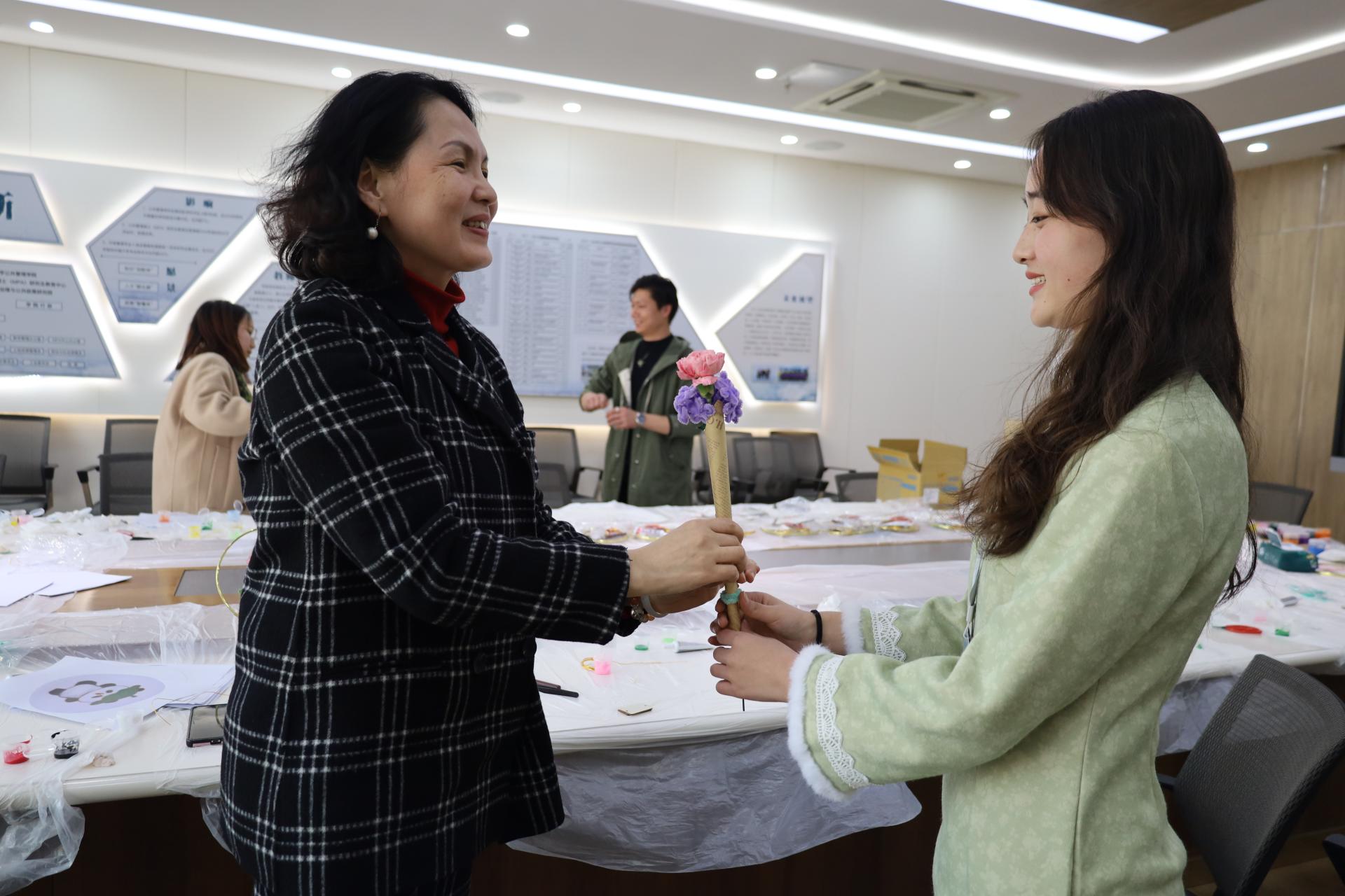 此外,活动现场还设置了拍照留念区,同学们带着自己亲手制作的小礼品拍照留念,留下美好的回忆。为了让浪漫的春意得到更广泛的传递,一部分同学将自己亲手制作的小礼品精心包装,带着满满的诚意和祝福,送到了学院老师手中。当老师们接过这些充满心意的礼物时,眼中闪烁着惊喜与感动的光芒,收到手工花束的老师表示,这不仅是一份礼物,更是一份深厚的情感与尊重,让她们感受到了节日的温暖。