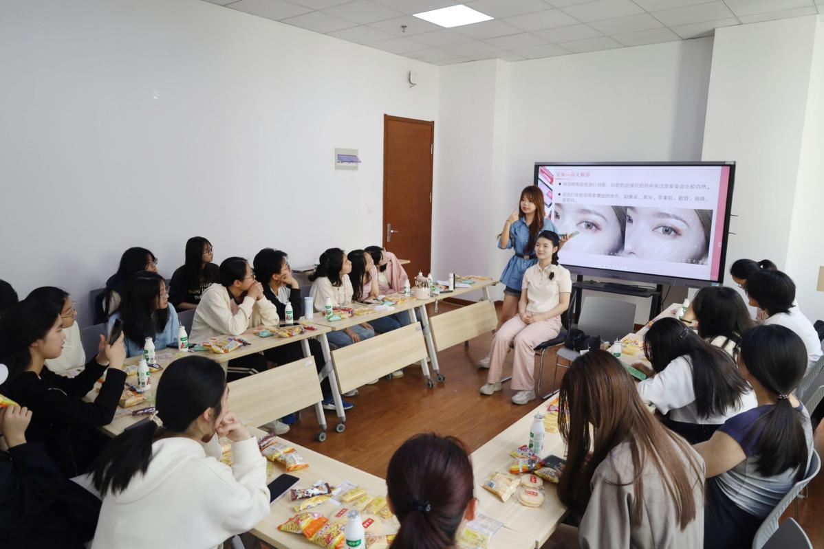 彭馨从“化妆可以让女生变得更自信”引入,她围绕肤色、肤质等方面进行详细讲解,强调同学们要根据肤质和肤色来选择更加适合自己的美妆产品。为了更直观展示化妆步骤及技巧,她邀请一位同学作为模特进行实操展示,从底妆、遮瑕、高光修容、腮红、眉毛等角度细致地讲述实用的上妆技巧,并对新手如何选择更适合自己的美妆产品给出建议。