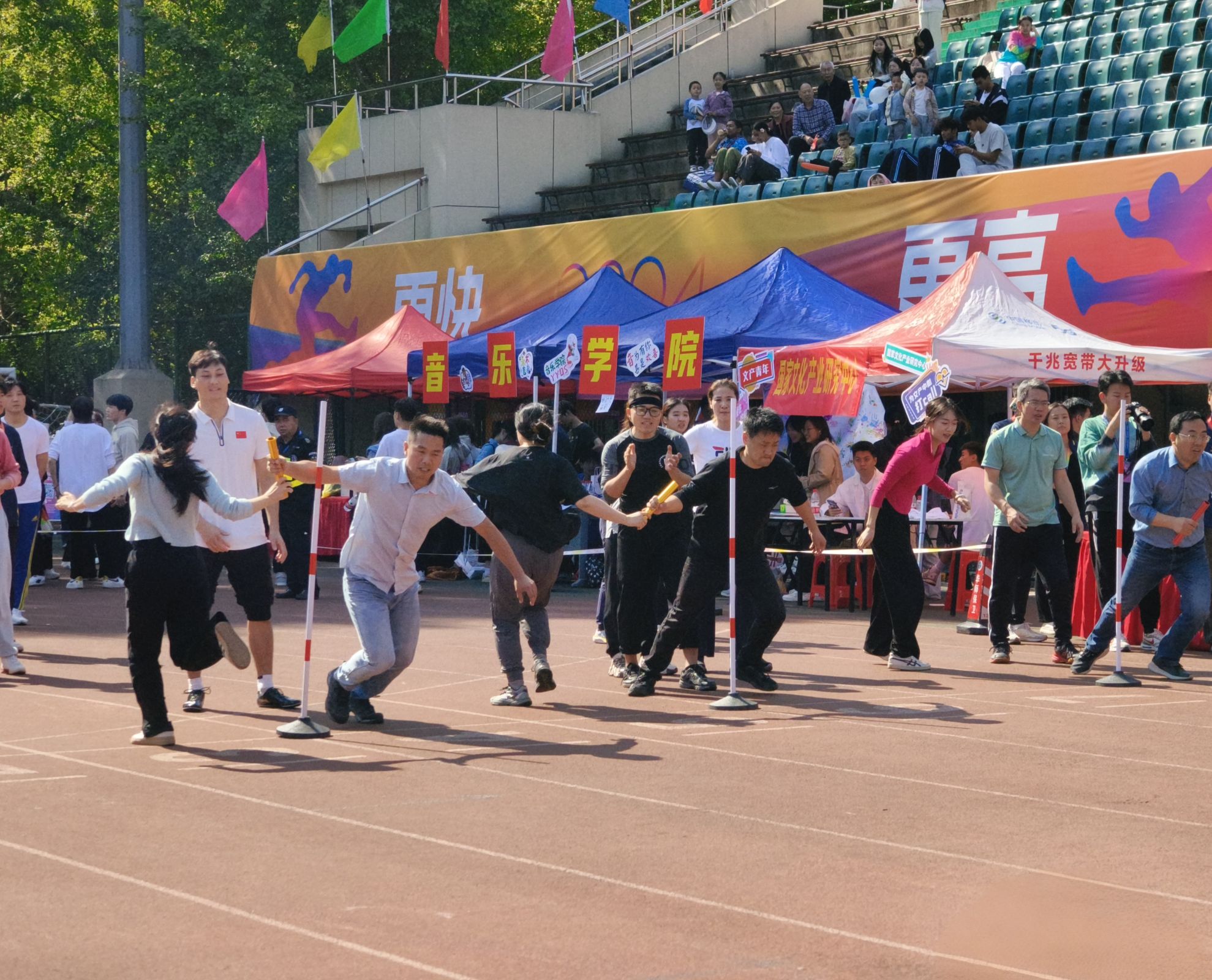 在五十米迎面接力比赛中,随着一声枪响,公管教职工如离弦之箭般冲出起跑线,展开一场速度与激情的较量。从三尺讲台到百米赛场,教职工们将粉笔转化作接力棒,传递着知识与精神。赛道上,他们目光坚定,每一步都踏出了坚定的决心。在交接棒的瞬间,他们配合默契, 成功地完成了每一次交接。尽管对手强大,但他们始终保持着稳定的节奏,坚持不懈地向着终点冲刺。他们用实际行动诠释了“更快、更高、更强”的体育精神,展现了公管学院团结一致,勇于挑战自我的精神风貌。