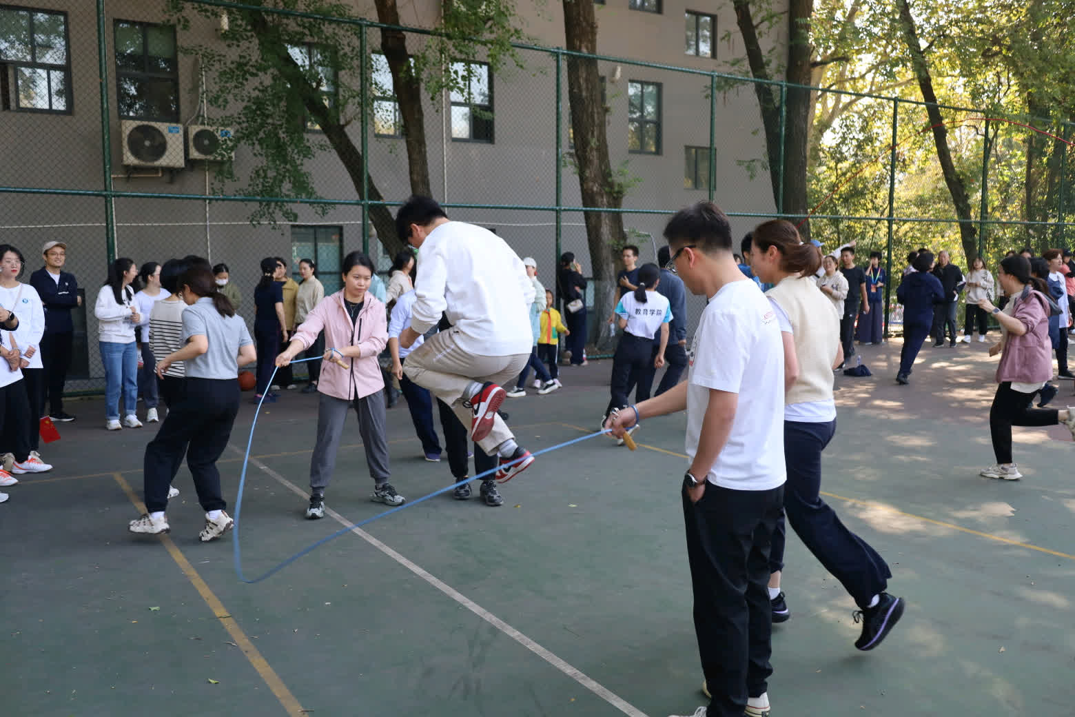 比赛项目分为跳绳、定点投篮和50米迎面接力,这些项目不仅是对教职工个人体育素质的全面考验,更是对教职工之间默契配合与团结协作精神的生动展现。10月31日上午,暖阳煦煦,微风习习,全体教职工参加跳绳项目。在比赛中,教职工们斗志昂扬,他们摇动着握把,配合着绳索的节奏快速上下跳动,步步生风。同学们呐喊助威,教职工们奋勇争先,以饱满的精神状态和优异的表现向同学们展示了体育的魅力,诠释了体育精神的真谛,也向外展示了公管学院上下同心,共同进步的信念。