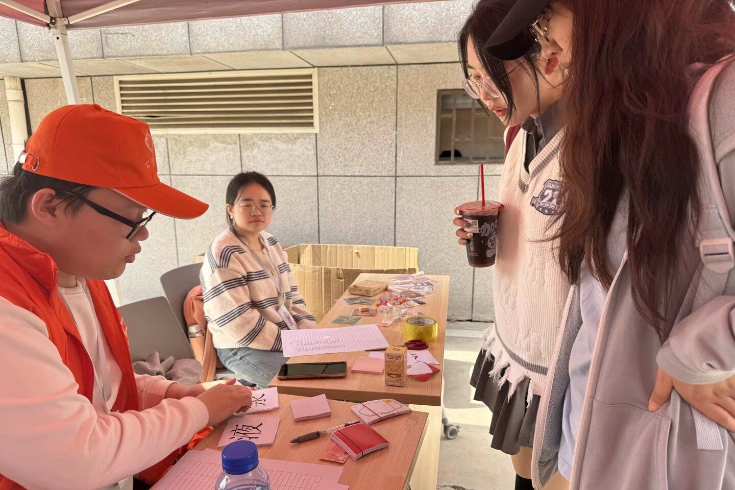 第二组志愿者负责“热血印记,爱心传递”活动和“热血拼字王”活动。参与同学自己设计一句献血口号和对献血者的祝福,并写在便签贴上后在留言板处粘贴。贴好便签的同学可以参与拼字游戏,在一定时间内,利用给定的字拼出与献血知识相关的词汇,成功拼出1-2个词汇即挑战成功。顺利完成两个游戏的同学即可参与抽奖,获得盲盒、书签等小礼品。在参与游戏的过程中,同学们不仅表达了自己对献血者的敬意和心声,还直观地学习了献血相关词汇和知识,有效扩充了自身的献血知识储备,进而推动了更为理性、正确认知的形成。
