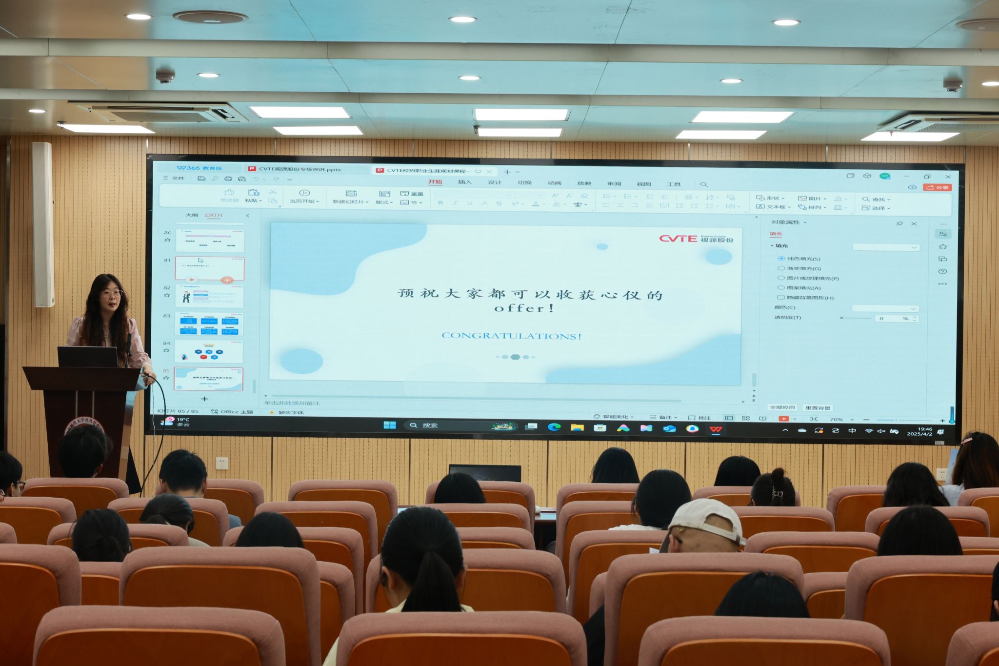 华大青年讯(通讯员 张彤 金煜翔)为帮助同学进一步明晰就业规划,4月2日晚上,“管出精彩,理出未来”企业进校园系列活动——CVTE视源股份华中师范大学专场交流会在南湖综合楼8001报告厅举行。广州视源电子科技股份公司面试官王梦妍受邀主讲,公共管理学院、人工智能教育学部等多个学院的2025届、2026届毕业生报名参加。