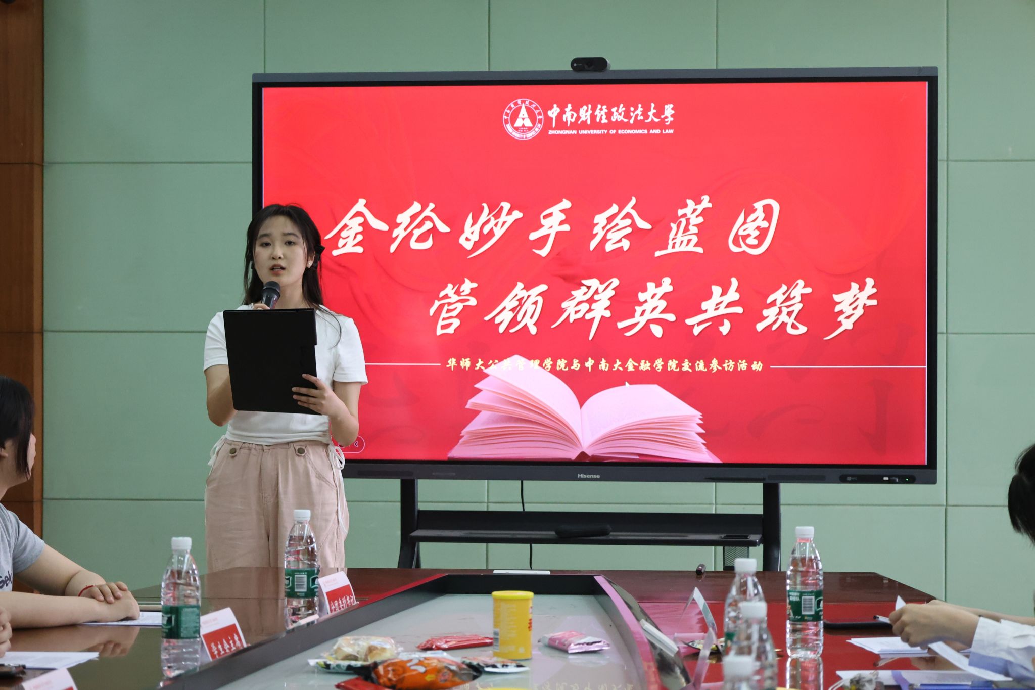 华师公管学院团委副书记石静琪在简单介绍学校及学院的规模及文化精神后,详细介绍了学院团委、学生会的组织架构和特色活动,展示了团委学生会“公管团学,永远团结”的口号以及学院“小管IP形象”,生动阐释“服务为本”的工作理念,并表示期待后续更深入的交流。