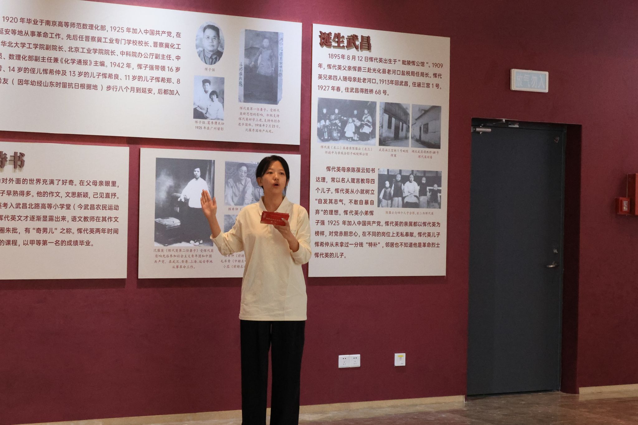 在恽代英讲师团讲解员陈翾翾的带领下,团学骨干们步入展厅。从“五四弄潮”,恽代英高举反帝爱国大旗,成为武汉地区学生运动的引领者,到他组建利群书社,传播进步思想火种;从创办并主编《中国青年》,启发无数青年走上革命道路,到投身南昌起义、广州起义,在武装斗争中披荆斩棘……陈翾翾生动讲述,大家认真聆听,仿佛能看到恽代英为革命事业奔走呼号的身影。展厅内,珍贵的历史图片、翔实的文献资料、感人的革命故事,全方位呈现了恽代英波澜壮阔的一生。他坚定的理想信念、无畏的斗争精神、无私的奉献品格,深深触动着每一位参观者的心灵。