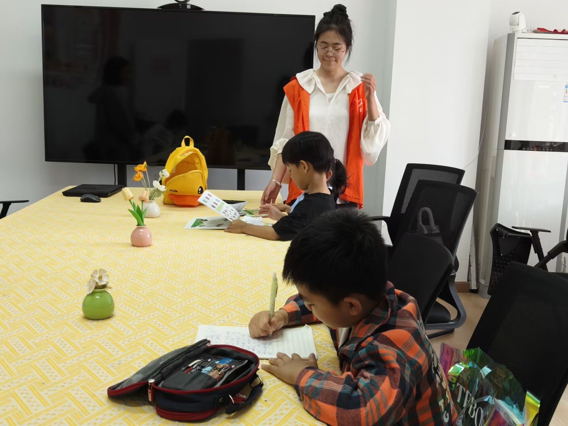 志愿者们根据小朋友的年级和学科薄弱点,利用自身优势分组展开作业辅导。针对数学应用题、语文诗词背诵等难点,志愿者们通过实际应用、趣味比喻、分段拆解等方式耐心讲解,帮助小朋友梳理解题思路,引导他们用彩色便签标注易错点,养成良好的学习习惯。