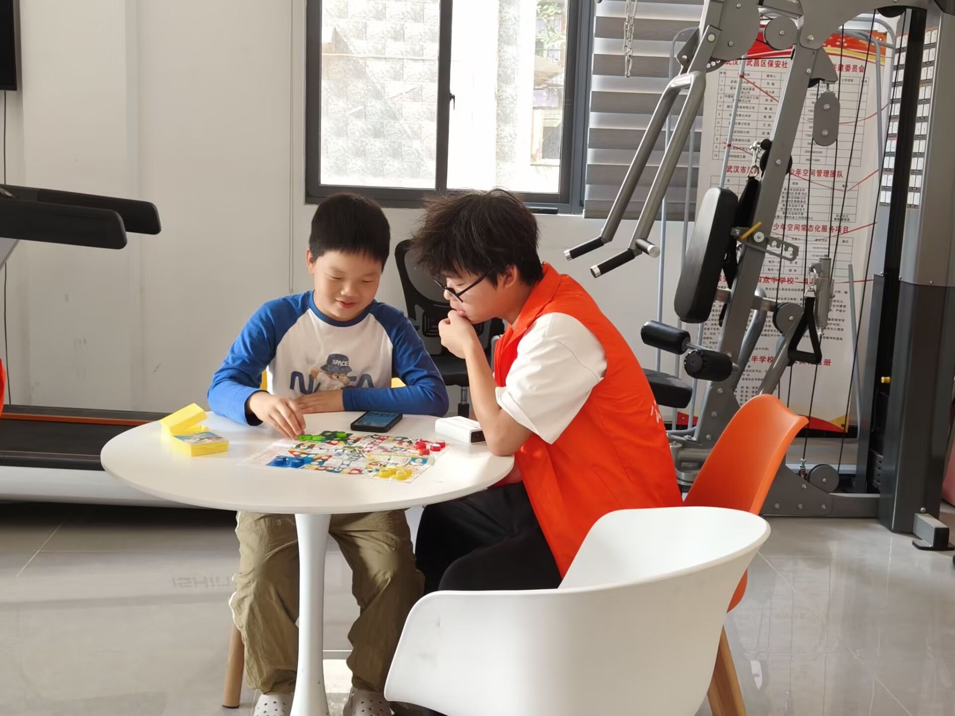 互动小游戏结束后,志愿者带领小朋友前往休息室开展飞行棋、五子棋、围棋等益智游戏。活动过程中,志愿者全程陪同并密切关注安全状况,同步提醒小朋友远离危险物品,以细致关怀守护活动秩序。通过开展各类对弈比拼游戏,小朋友们既锻炼了逻辑思维与专注力,又在互动协作中深化了友谊。