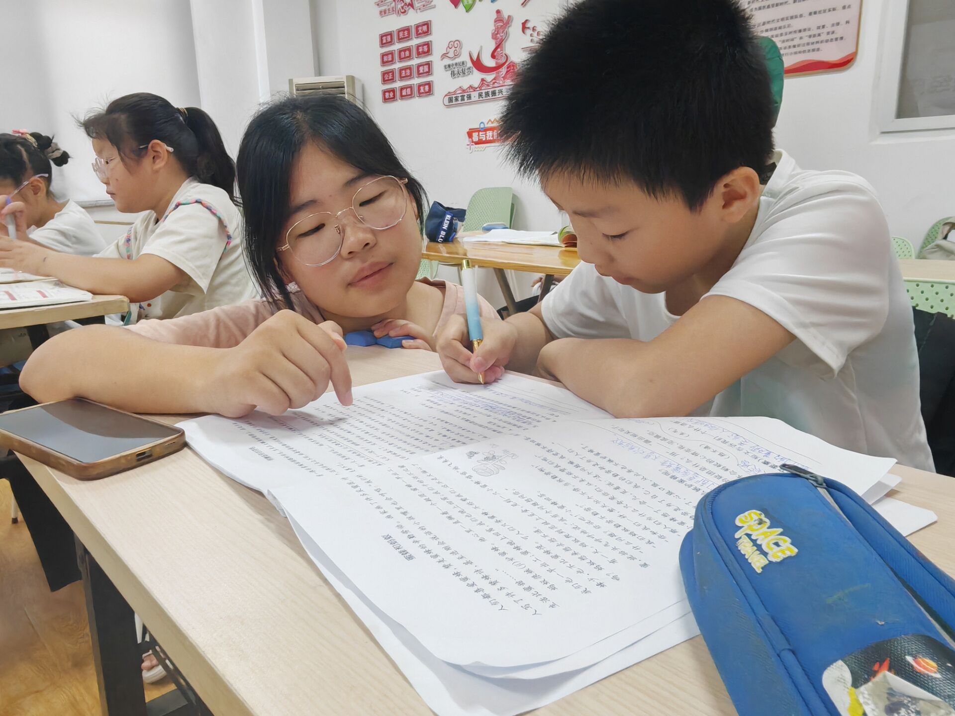 课程结束后,小朋友们迅速投入到作业环节中。小朋友们专注于自己的习题和阅读,当遇到不会的问题,他们积极地举手向志愿者哥哥姐姐们寻求帮助。志愿者们耐心地为小朋友们解答,帮助他们解决学习难题、巩固知识点,为小朋友的学习查缺补漏。