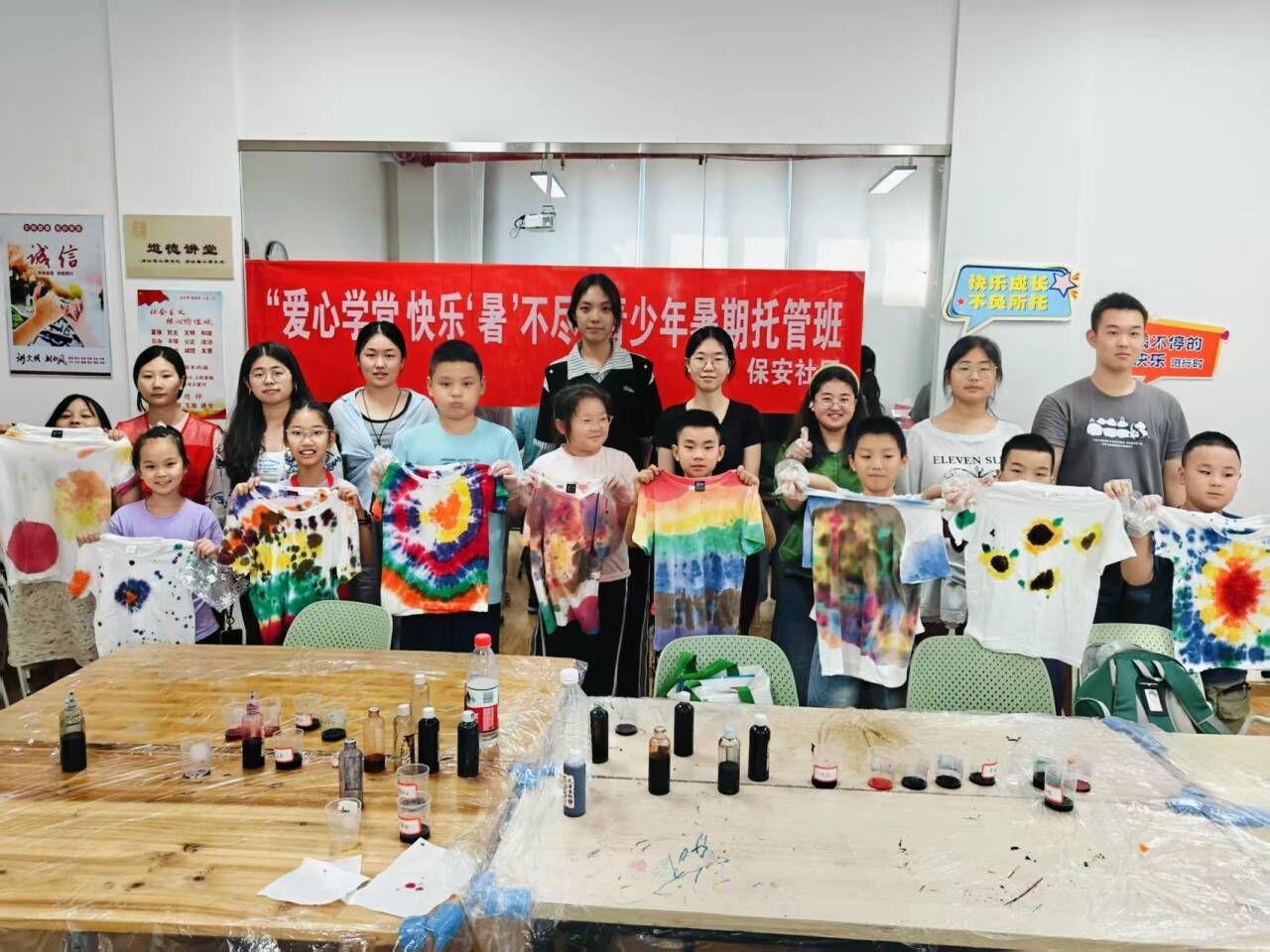 学习课程结束后,进入轻松的手工制作环节。开班当天,志愿者们使用“爱心托管班”物资包,带领小朋友们开展了有关“小汽车”“小飞机”的手工制作活动。在接下来的几天里,志愿者们分别为小朋友们讲解了风帆车制作、衣服扎染、油纸伞绘画等手工课程。小朋友们对每一次的手工活动都充满热情,积极参与,与小伙伴互帮互助一起完成每次的手工制作。丰富且有趣的手工课程不仅锻炼了小朋友们的动手能力,更激发了他们的想象力,引领小朋友们打开艺术之门。