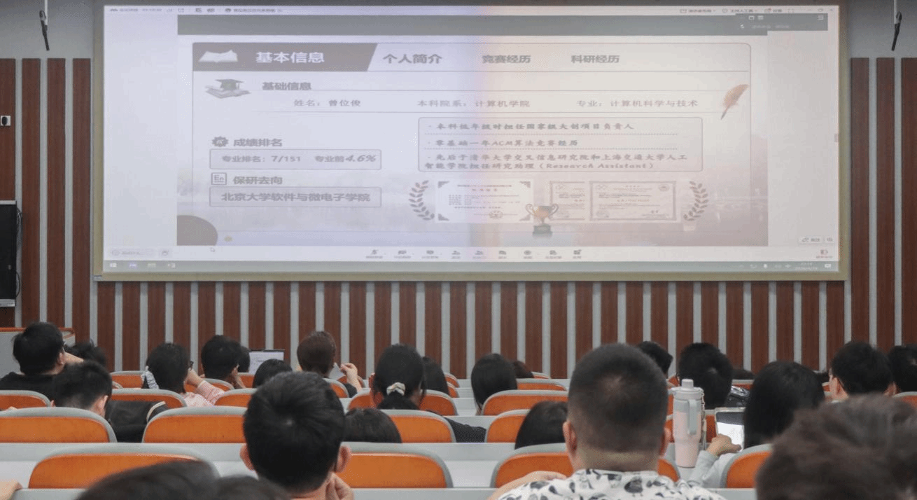 曾位俊围绕推免流程与面试技巧展开分享。他结合自身经验提醒有意向保研的同学们,九月中旬是推免材料提交与名额敲定的关键时期,应提前关注相关信息,主动积累科研项目与实践经历,为升学申请筑牢信息与能力基础。针对面试环节,他强调需熟练掌握项目细节、拓宽知识视野,简历需突出科研成果与实践经历,充分凸显个人优势。立足当前行业发展趋势,他指出AI技术的发展是必然方向,建议同学们科学规划升学路径、把握时代发展机遇。