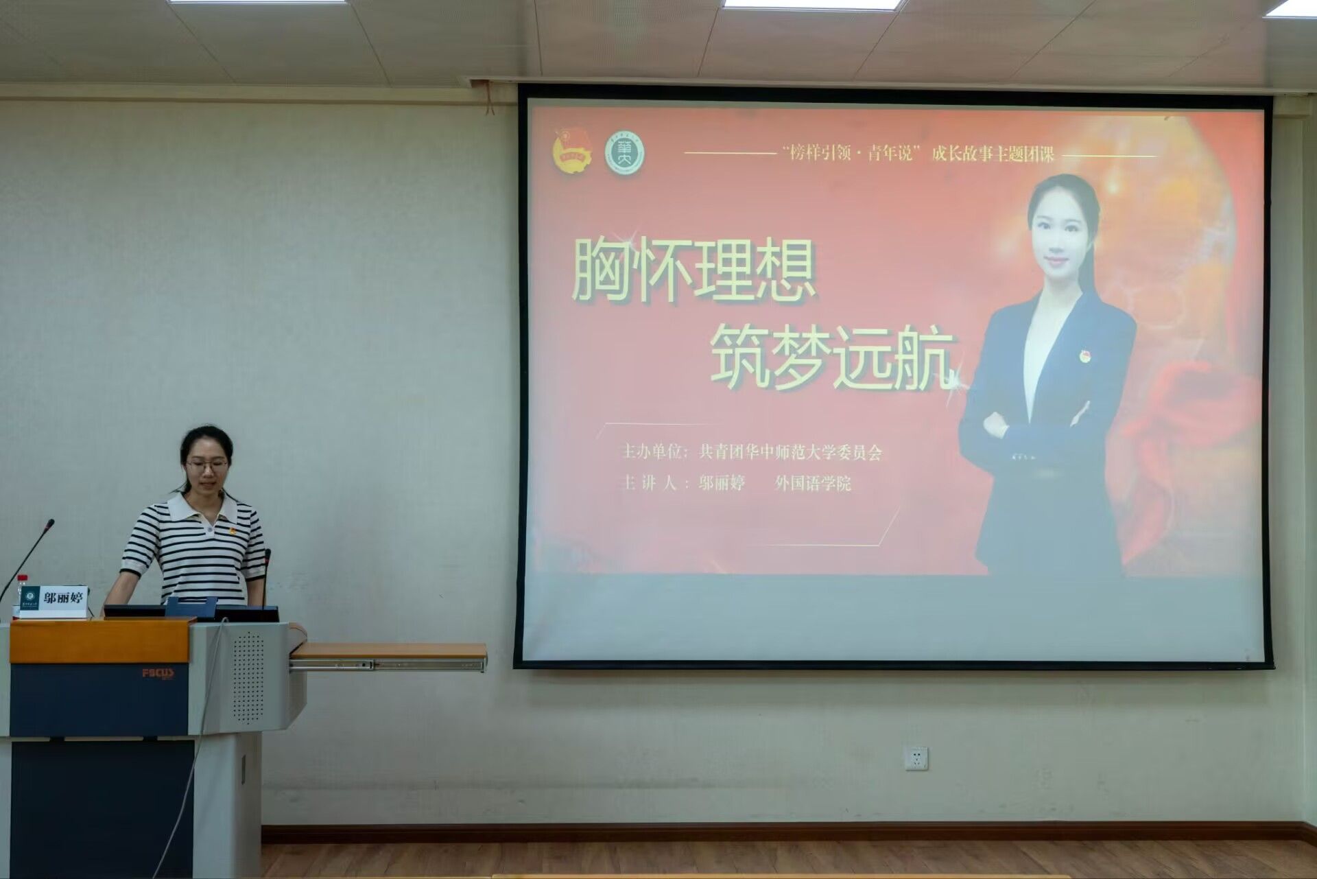 在互动环节,邬丽婷鼓励同学们积极参与“孔子行脚・阳光支教”等社会实践活动,通过志愿服务厚植家国情怀。她还分享了自己作为华中师范大学代表参加第十四届MODEL APEC全国大会的经历,讲述了如何在国际模拟平台上为“中国式现代化”发声,展现了华师学子的风采与担当。