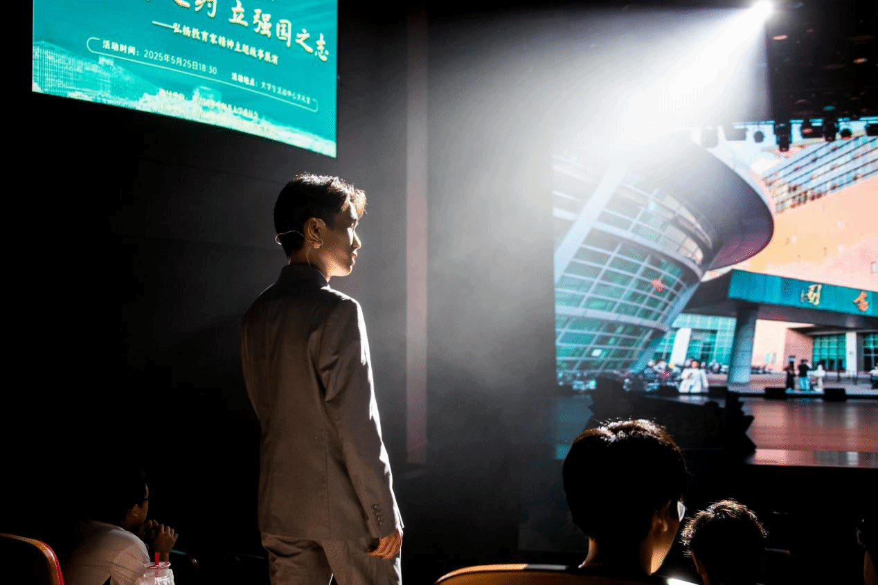 本次展演采用“光影叙事+时空对话”形式,创新采用“双线叙事”结构,通过老年学生与青年学生的跨时空对话,将孔子木杖、袁吉六教案、华小诗粉笔等意象有机串联。舞台借助灯光分区与投影技术实现场景转换,从杏坛古树到桂子山课堂,从战火窑洞到现代教室,在虚实交融、古今交错中勾勒教育发展的壮阔脉络。在场同学感慨道:“这场展演让我深刻理解了‘师范’二字的重量。未来无论站在讲台还是山区,我都愿做点燃火种的人!”