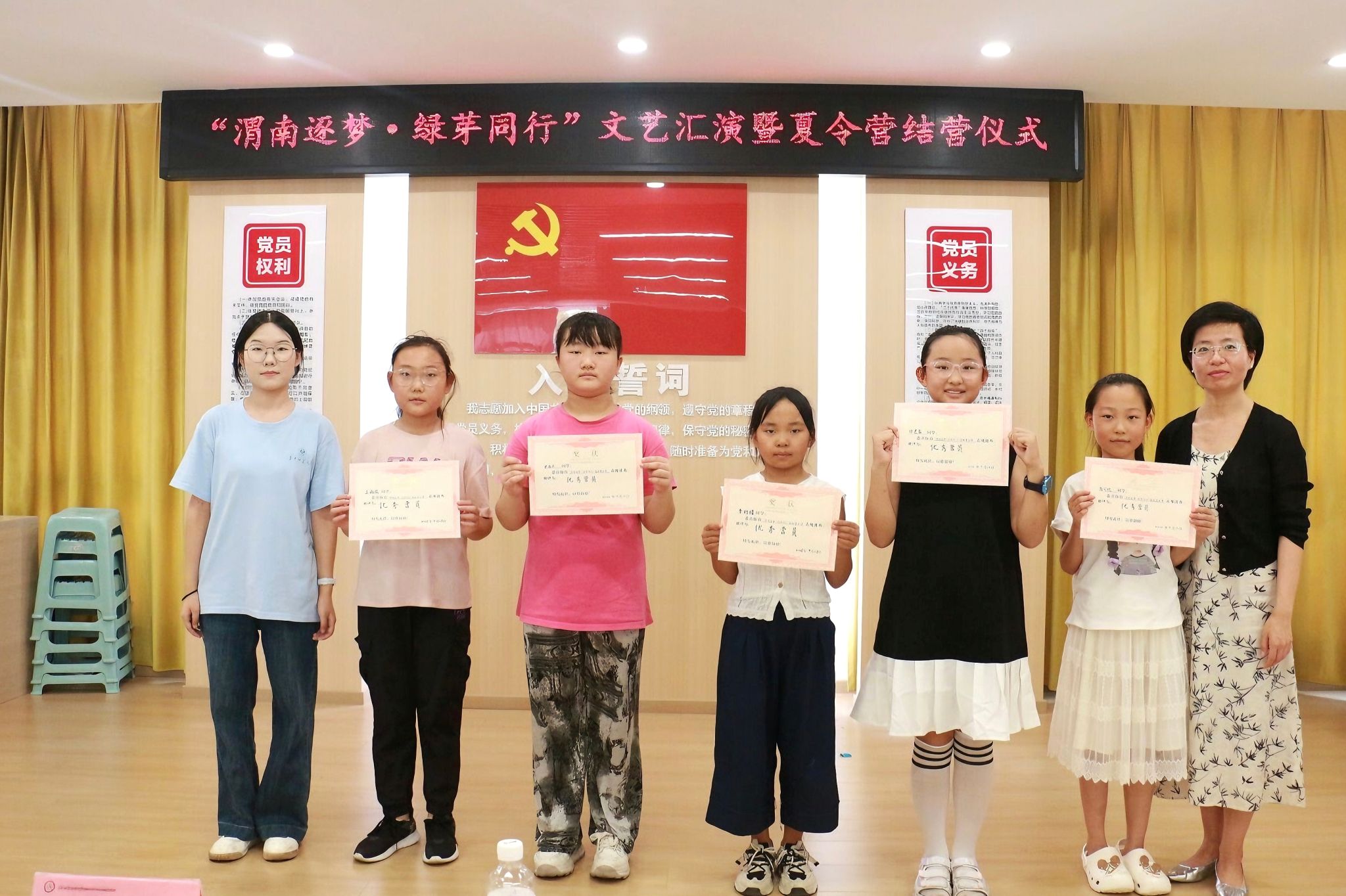 表彰环节,主持人宣读了暑期夏令营优秀营员与合格营员名单。杨丽洁与绿芽实践队队长曹梦茹共同为优秀营员颁发荣誉证书;赵明伟与绿芽实践队副队长雷佳妮、孙亚男与绿芽实践队副队长牛钰渟分别为合格营员代表颁奖。赠旗仪式上,绿芽实践队分别向共青团澄城县委、城关街道办、幸福社区赠送锦旗。