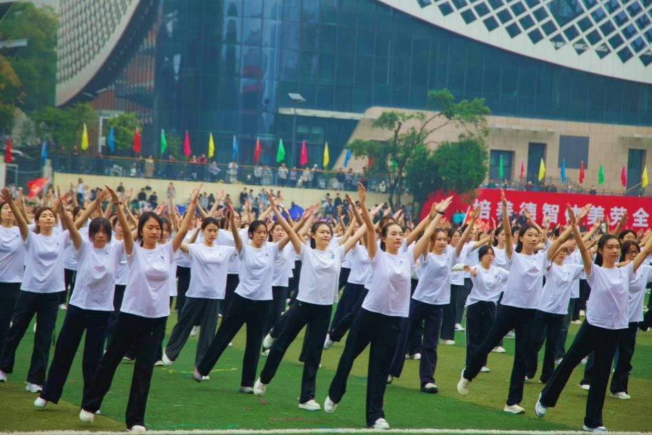 紧接着,广播体操队队员以饱满精神亮相,在昂扬的音乐声中,她们身姿挺拔、动作规范,从伸展到弯腰,每一个细节都精准到位,既展现了扎实的体能素养,更诠释了团结协作的集体精神,赢得在场师生阵阵掌声。
