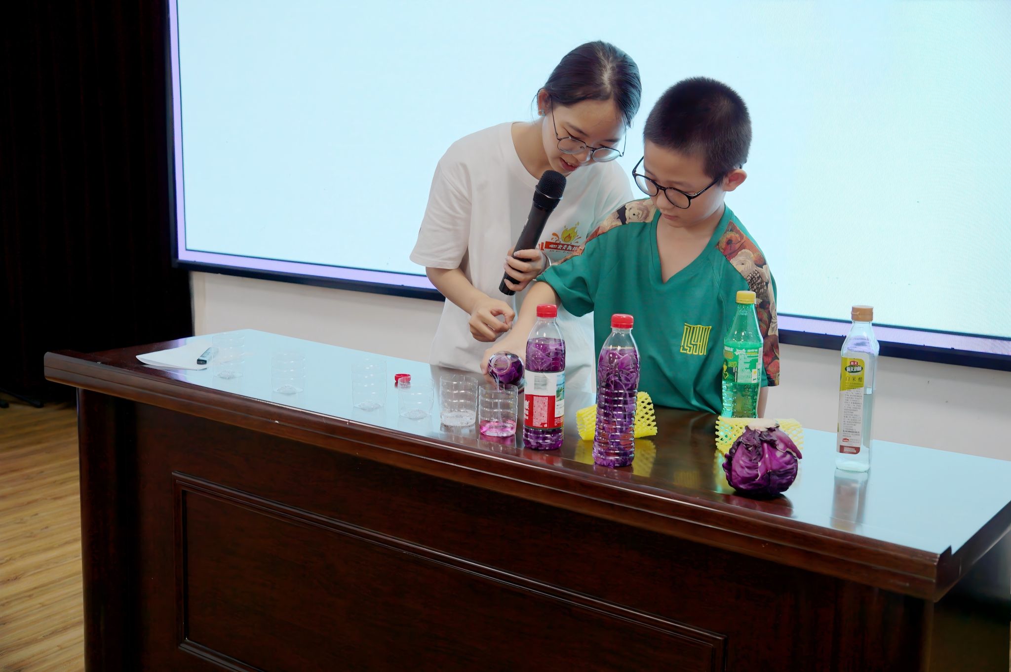 当紫甘蓝溶液遇到碳酸饮料会变成粉红色,遇到肥皂水又会变成蓝色——这不是魔法,是科学!蔡晓以“魔法药水”为引子,从常见的紫甘蓝入手,通过实验让学生观察其溶液与酸性、碱性液体的变色反应。当碳酸饮料倒入紫甘蓝溶液中泛起粉红泡沫,当肥皂水注入后晕开一片湛蓝,同学们不时发出惊叹。蔡晓借此解释酸碱反应的内在机理,同时,还延伸到紫甘蓝的营养价值,呼吁同学们不挑食、多观察生活。这堂课程以生活中常见的食材为载体,让抽象的化学知识变得可触可感,悄然播下了科学探索的种子。