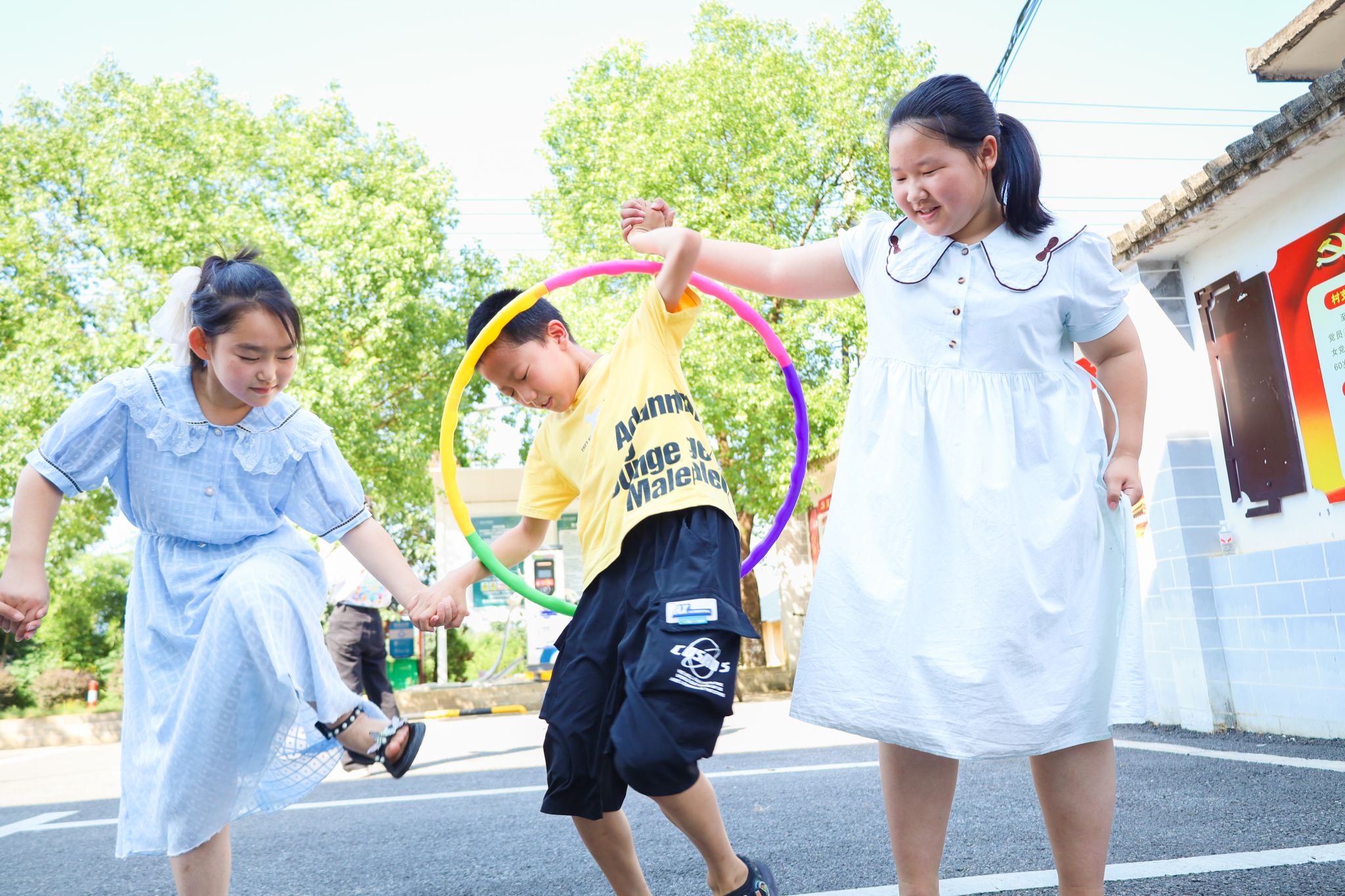 此外,洪泉村还开展了“呼啦圈过山车”“英雄炸碉堡”等项目,并进行五十米接力跑加时赛。学生们手牵手,运用身体韧性,以最快速度将呼啦圈传递给下一位组员。学生们还积极回答有关党史和革命英雄事迹的问题,若回答正确,可前进2米再投掷沙包,最终纸杯“碉堡”在猛烈“攻击”下迅速“瓦解”。学生们彼此合作,团结友爱,凭借智慧和力量取得了胜利,并感受到革命文化的熏陶。