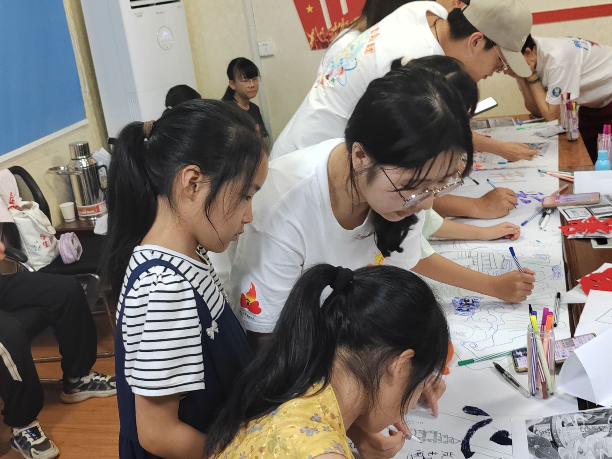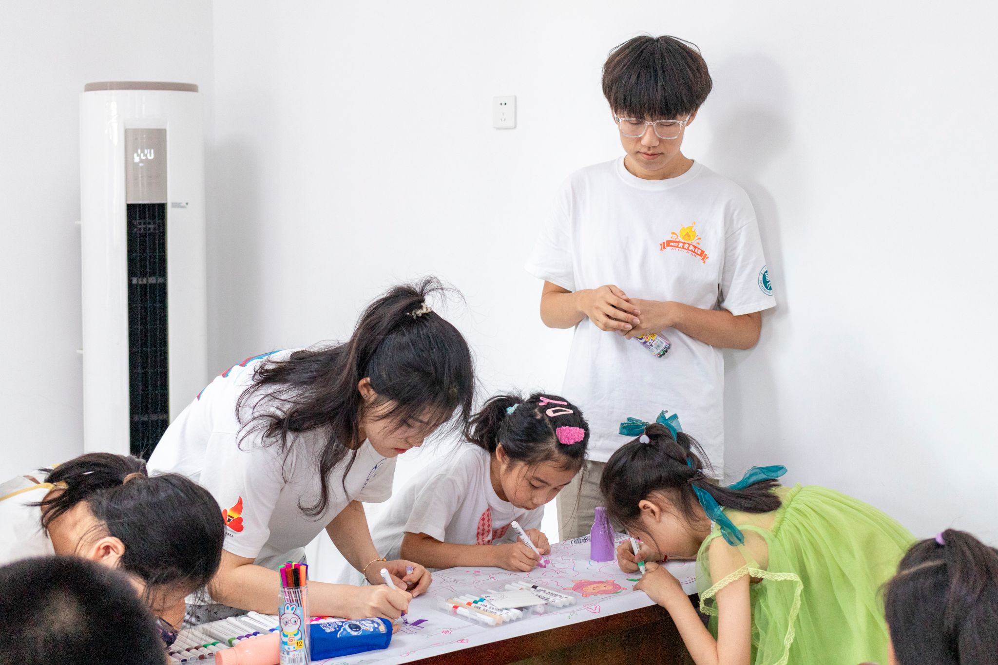 在绘制过程中,志愿者老师们同样注重激发孩子们的想象力和表达欲,引导孩子们将自己的观察、体验和情感融入笔端。志愿者们的真诚付出与孩子们的信任依赖,构成了一幅比画卷本身更动人的画面。在共同创作中,志愿者与孩子们的距离悄然拉近、情感也不断升温。