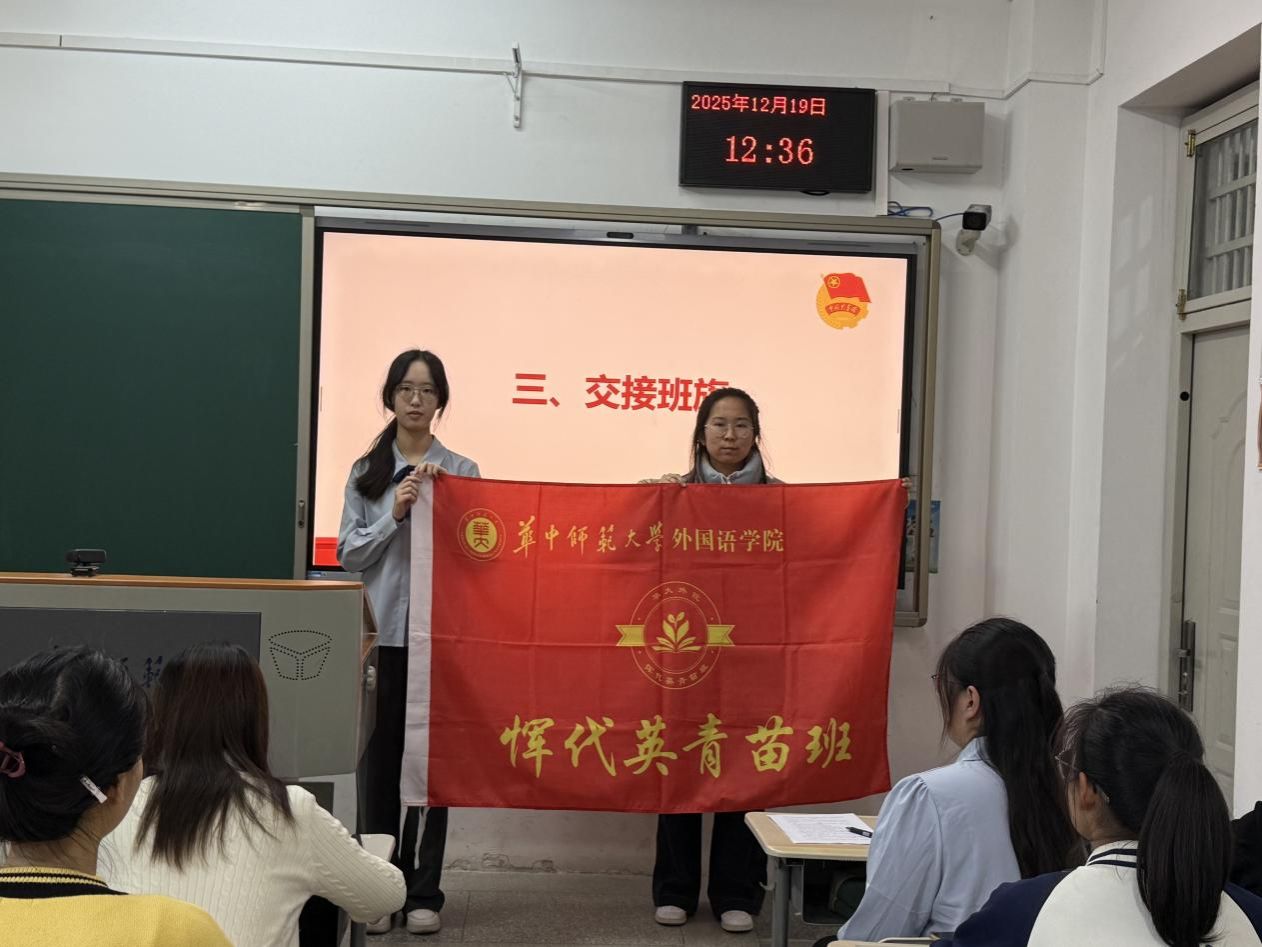 班旗交接仪式中,第五期恽代英青苗班班长刘曼彤从尹佳鑫手中接过班旗。作为学生代表,她表示未来要深植信仰之根,砥砺奋斗之志,积极学习,持续提高,为强国建设、民族复兴贡献力量。