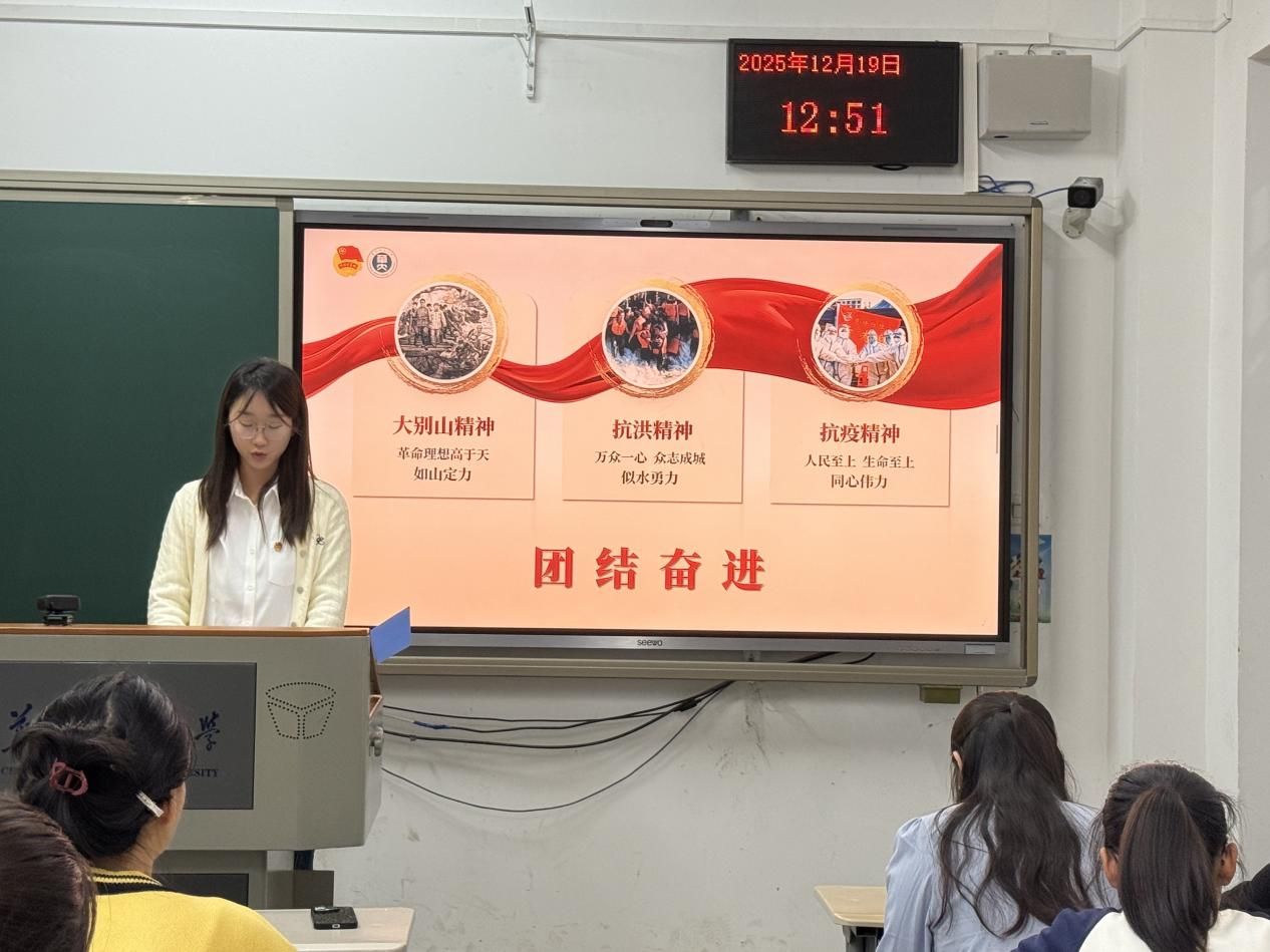 思想理论培训环节,主讲人孙瑜芯以“山的根基,水的搏击,气的同心:一条团结奋进的精神脉络”为主题,系统的讲解了“大别山精神”、“抗洪精神”和“抗疫精神”。她提到,新时代青年要系紧这条由山、水、气编织而成的精神纽带,推动“中国号”巨轮在新时代航程中破浪前行。