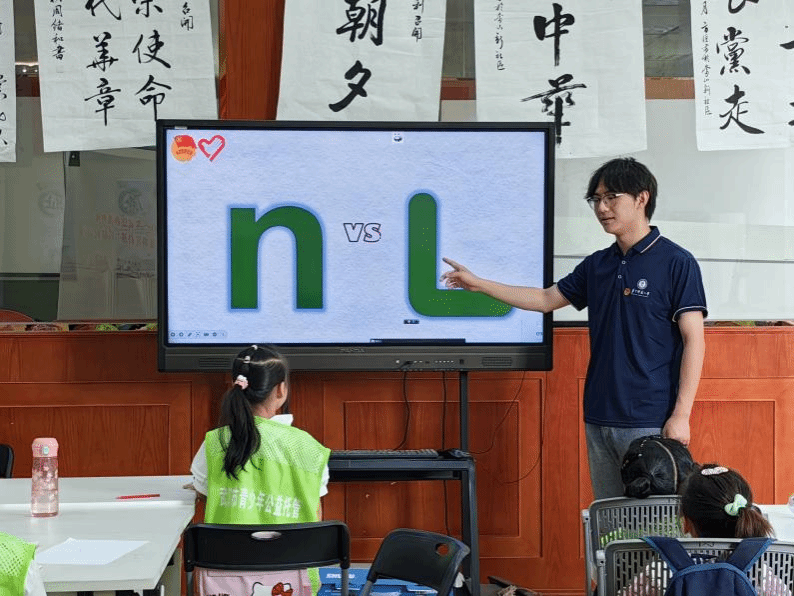 活动期间,实践队成员向青少年讲授由文学院设计的省级“爱心托管班”精品课程《舌尖上的普通话》。课堂上,队员们运用生动形象的图片、有趣的动画视频,向孩子们讲解普通话的发音规则、声调变化等基础知识。为了让学生们更好地理解和掌握,队员们还结合日常生活场景,进行情景模拟对话,让孩子们在轻松愉快的氛围中感受普通话的魅力。