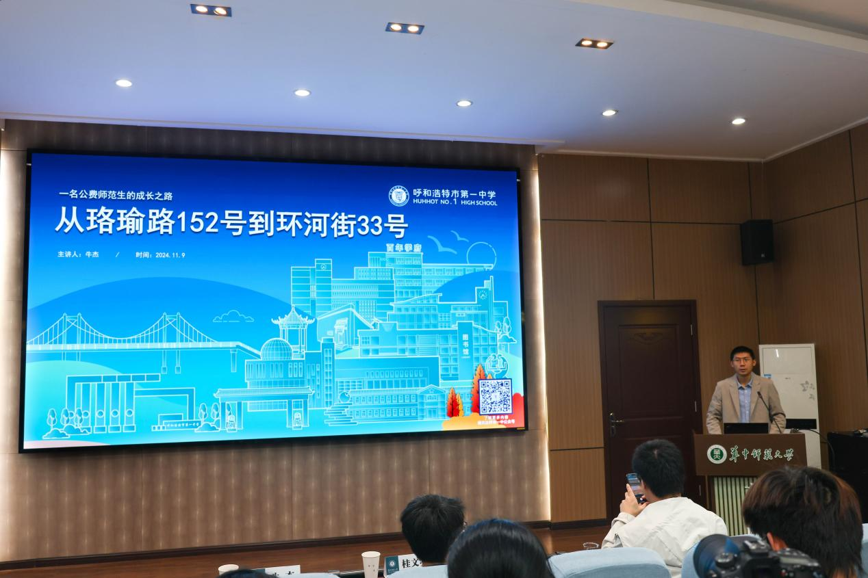 牛杰介绍了所在的呼和浩特市第一中学的学校、办学概况及公费师范生职业发展情况。他结合自身工作经历谈教师专业化发展路径,阐释教师素养与教育情怀,鼓励同学们发挥特长、积极探索。