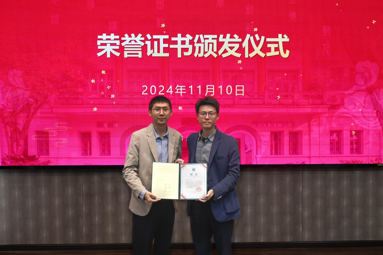 报告结束,桂文亮为牛杰颁发荣誉聘书。